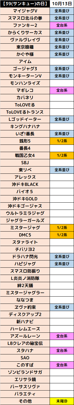 前回の39の日と同様に並びの仕掛けが大量に出現したため、次回の39の日も並びの仕掛けに注目しつつ、全台系などの仕掛けを見つける立ち回りが有効になりそうですね!
