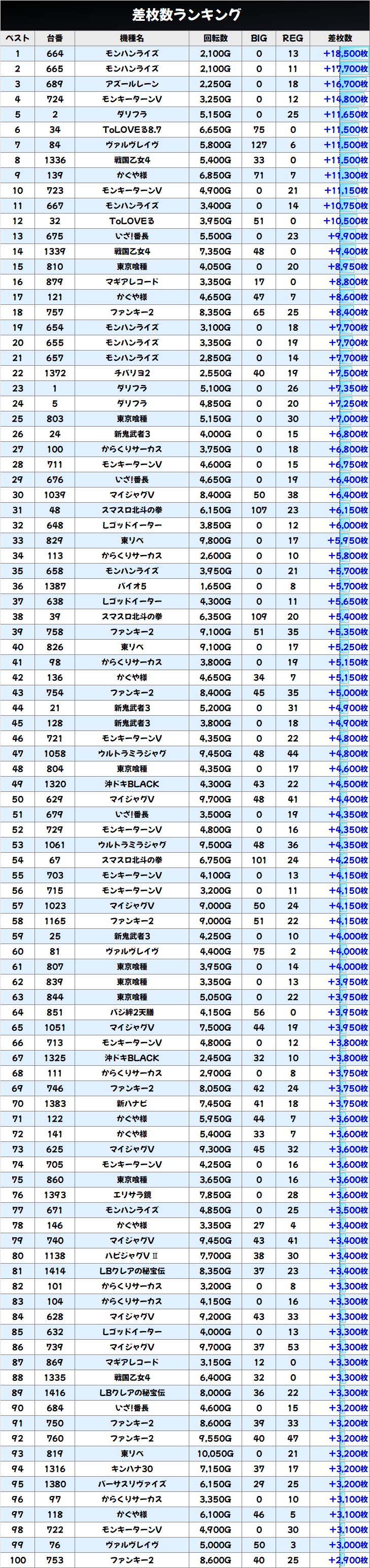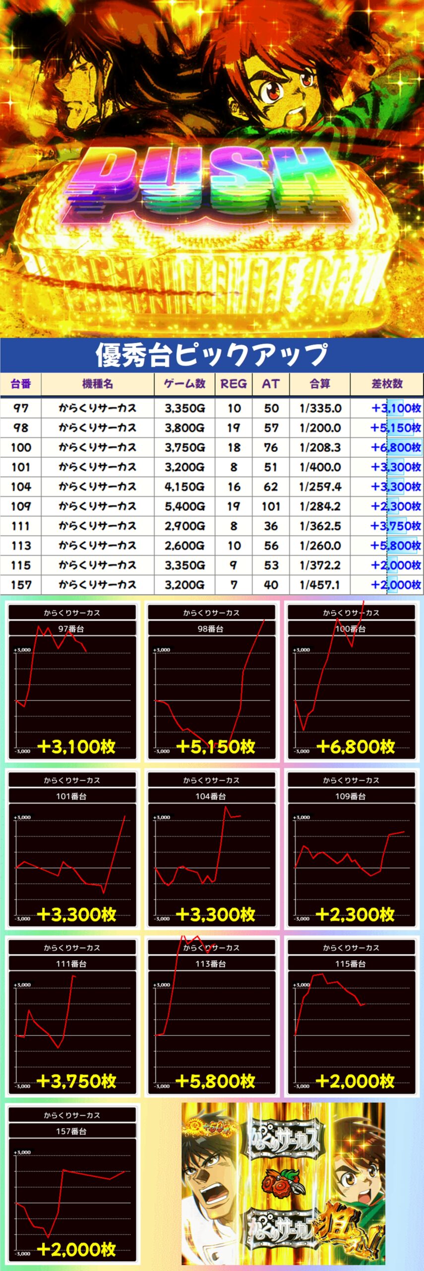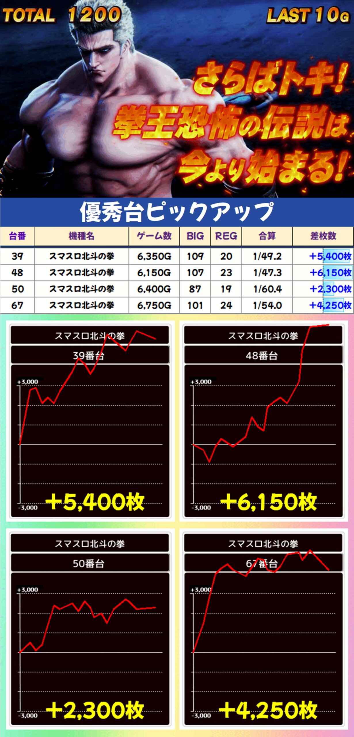 今回はスマスロ北斗の拳とからくりサーカスに並びの仕掛けがありましたが、それらも含めて各機種の優秀台(+2000枚以上)をピックアップしていきます。データをチェックして立ち回りの参考にしてください!