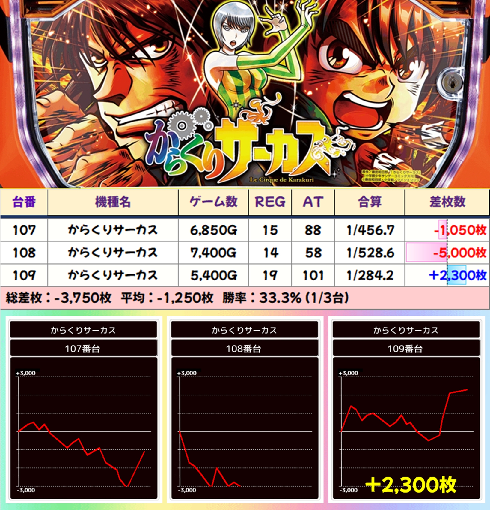 【3台並び】からくりサーカス(107-109番台)→平均-1,250枚