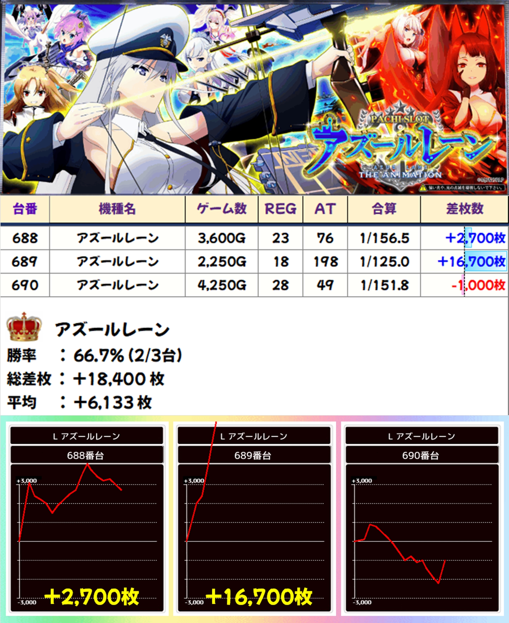 アズールレーンは前回の39の日に続いての全台系濃厚の仕掛けが出現!1台が不発となりましたが、+16700枚の大爆発台が出現しました!