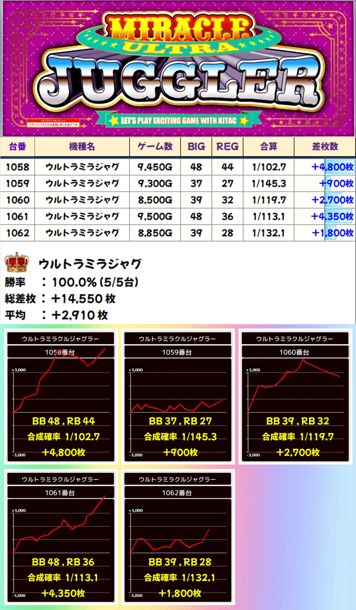 ウルトラミラジャグも全台がプラスとなり、打ち込みもバッチリ!+4800枚や+4350枚の大量出玉も出現しました!