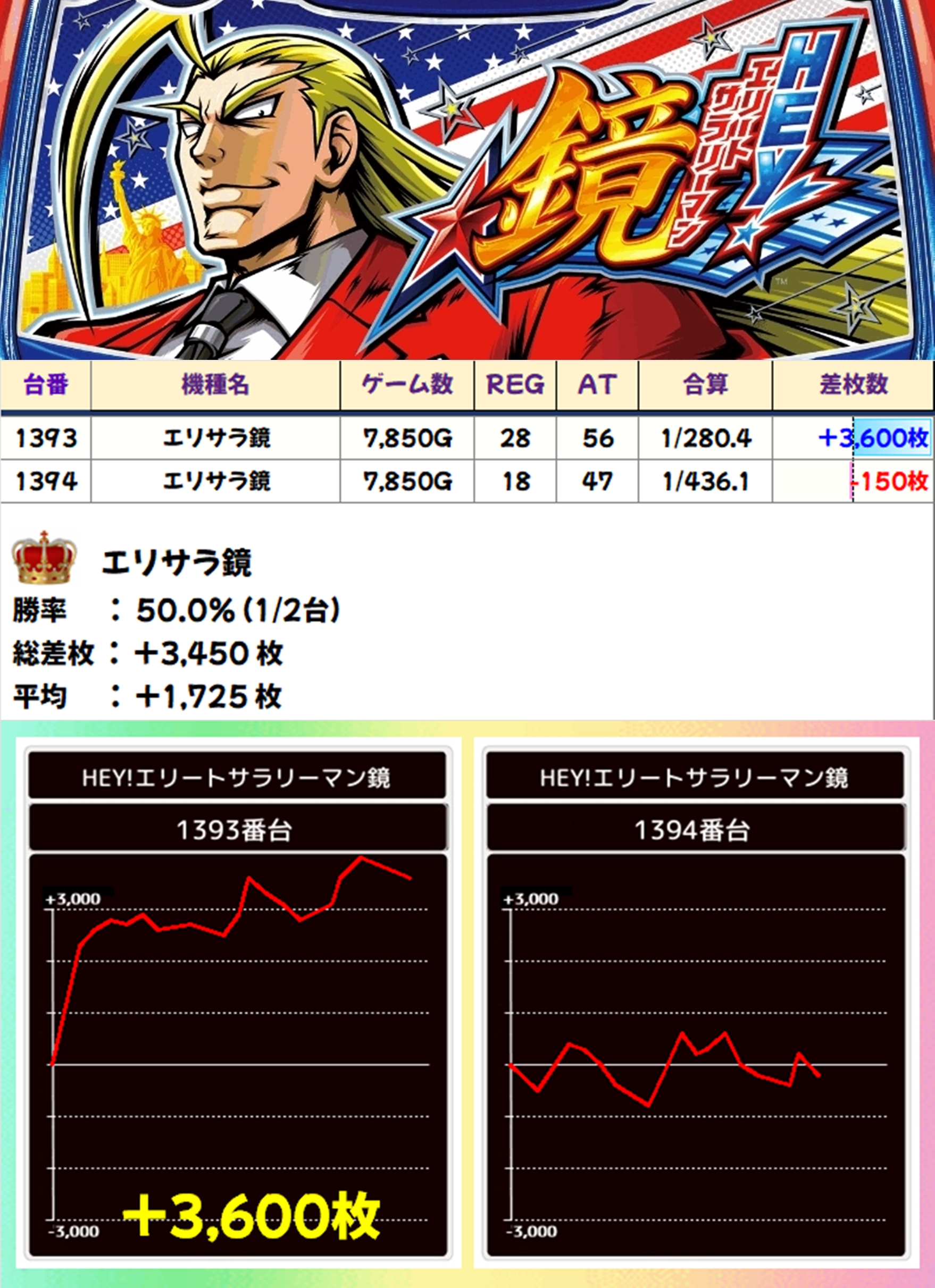 エリサラ鏡も不発台がありあしたが、1台は+3600枚の大量出玉を獲得!こちらの台は序盤から一気に出玉を伸ばすことに成功したようですね!