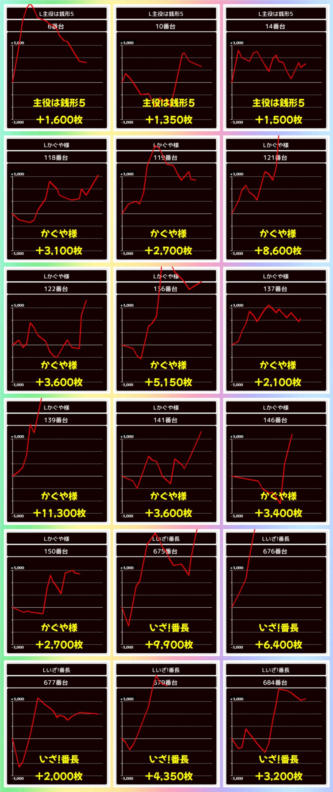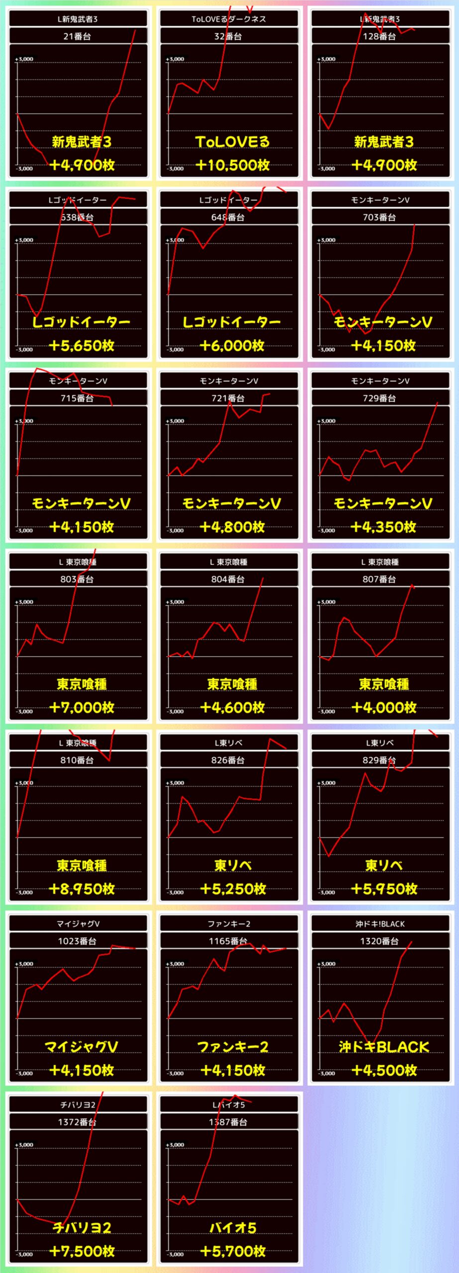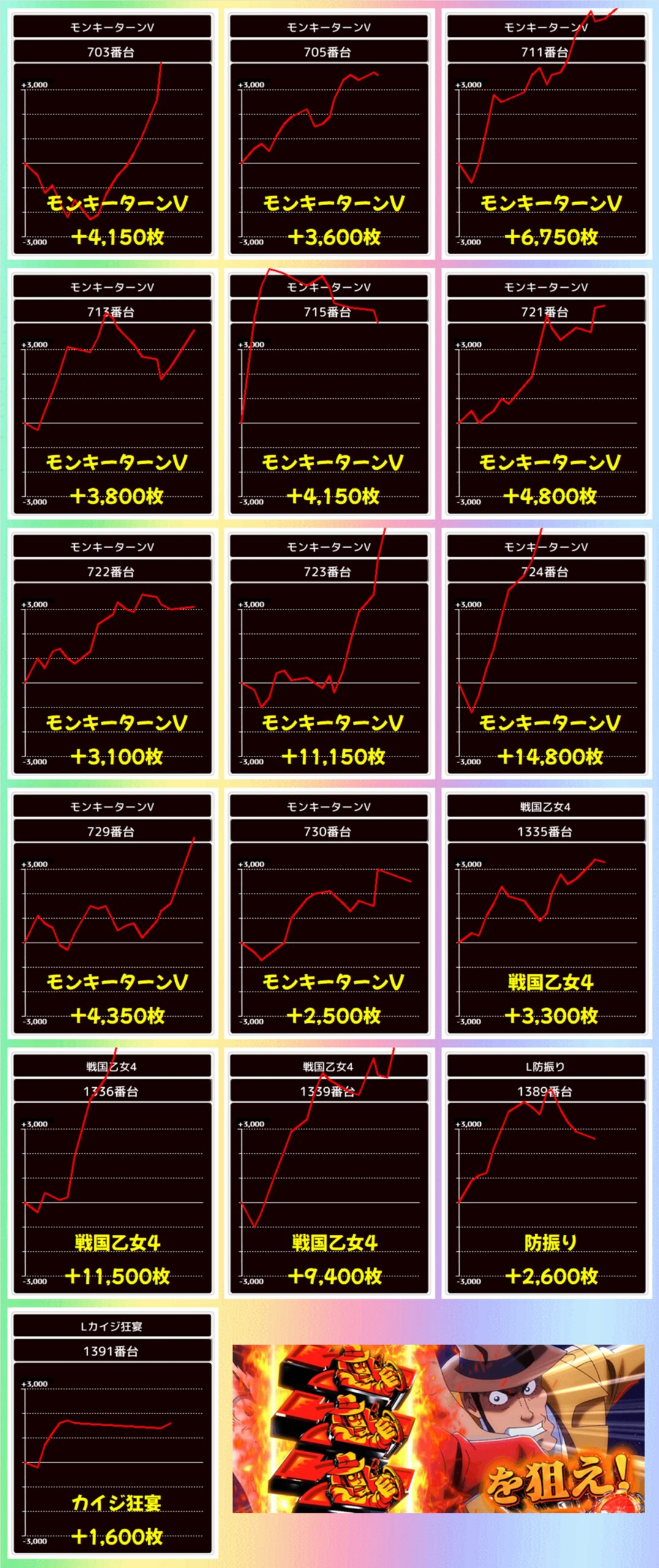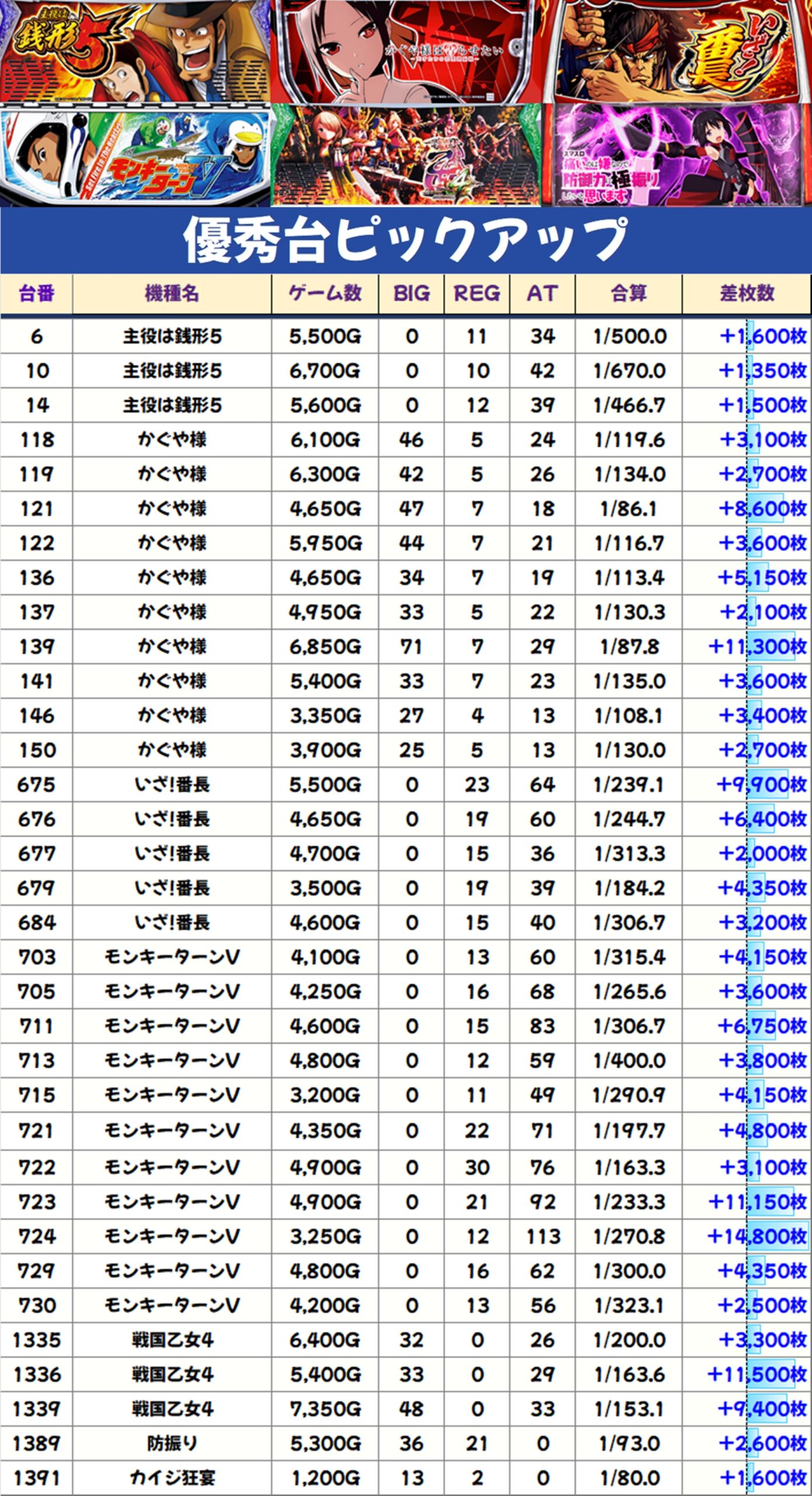 1/2系濃厚の仕掛けからはかぐや様とモンキーターンV、戦国乙女4から万枚オーバーの爆発台を確認。その他にも優秀な出玉を多数確認することができました。