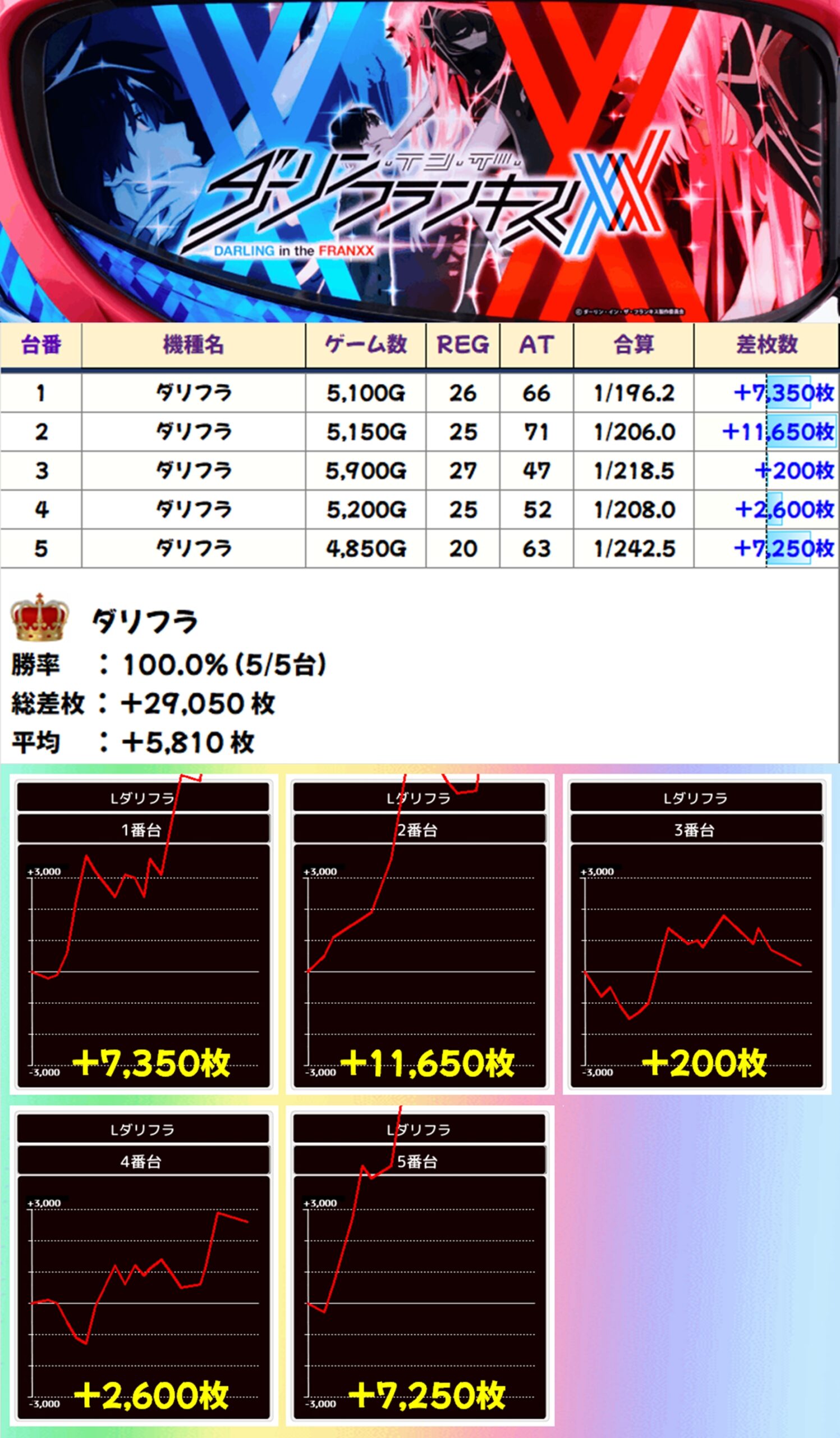ダリフラからも+11650枚の万枚オーバーが炸裂!ダリフラは全台がプラスとなり、平均+5810枚の素晴らしい結果を残しました!
