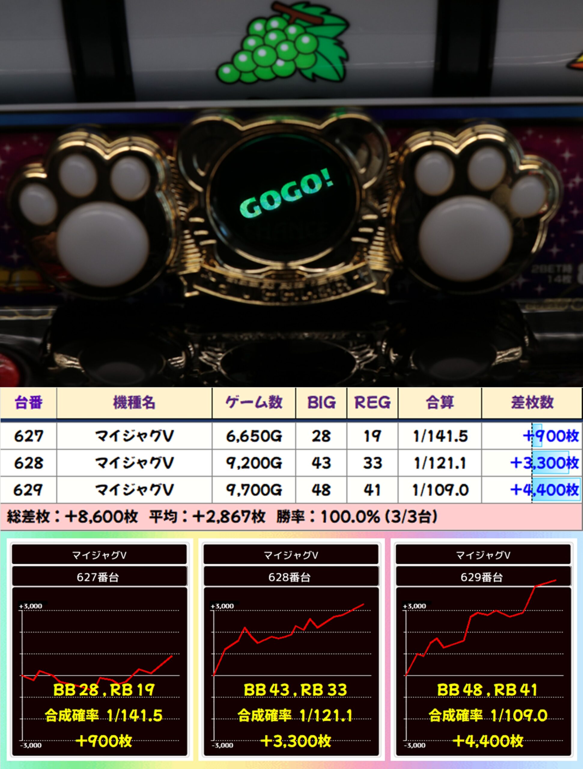 【3台並び】マイジャグ(627-629番台)→平均+2,867枚