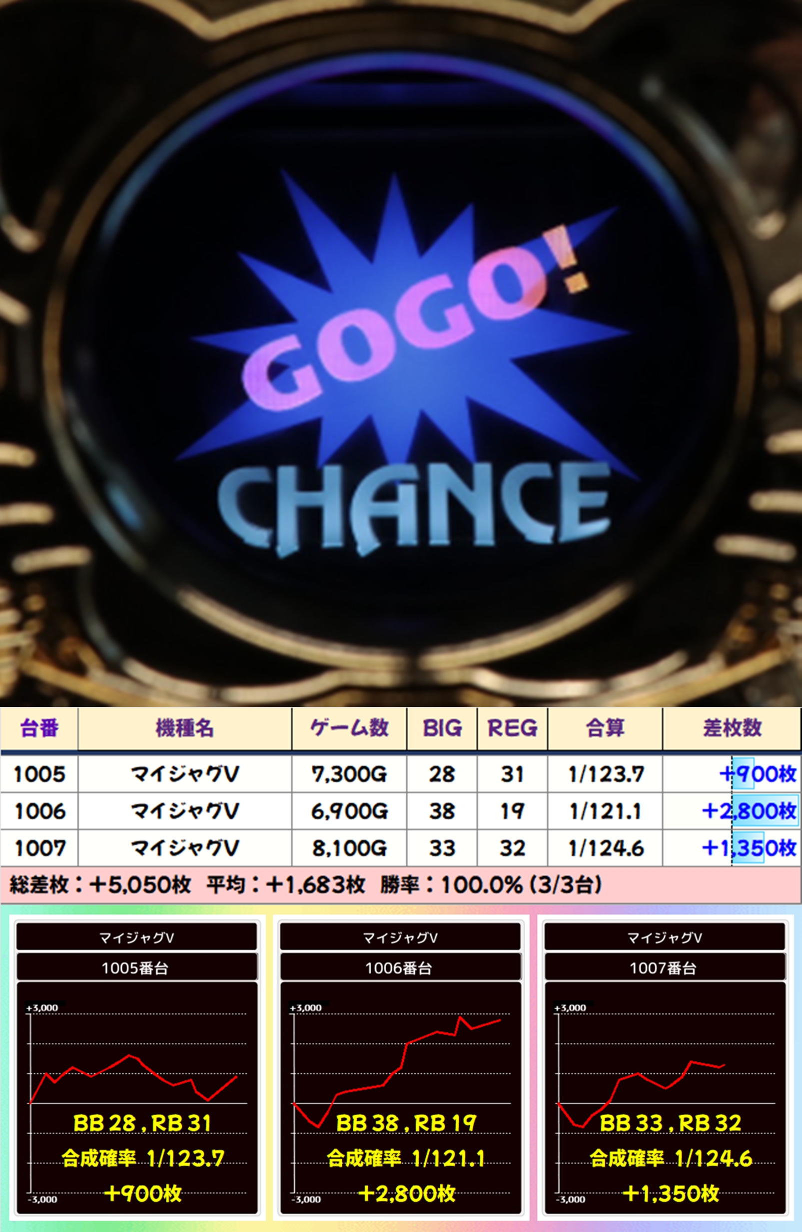 【3台並び】マイジャグV(1005-1007番台)→平均+1,683枚