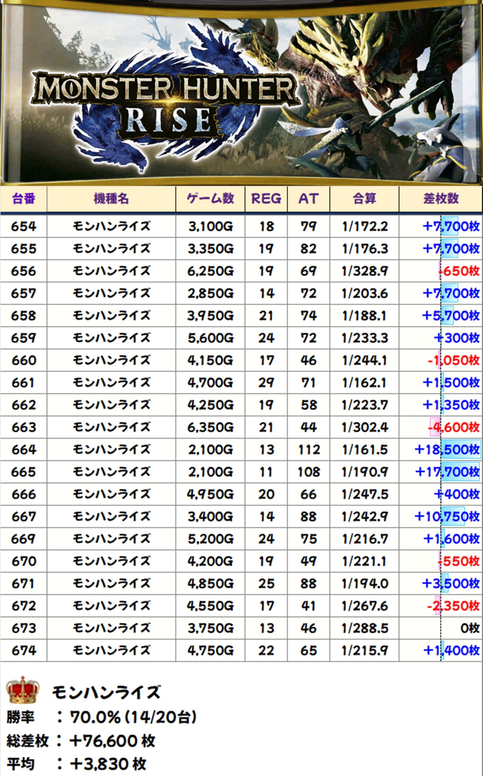 【全台系濃厚】モンハンライズ(14/20台+)→平均+3,830枚
