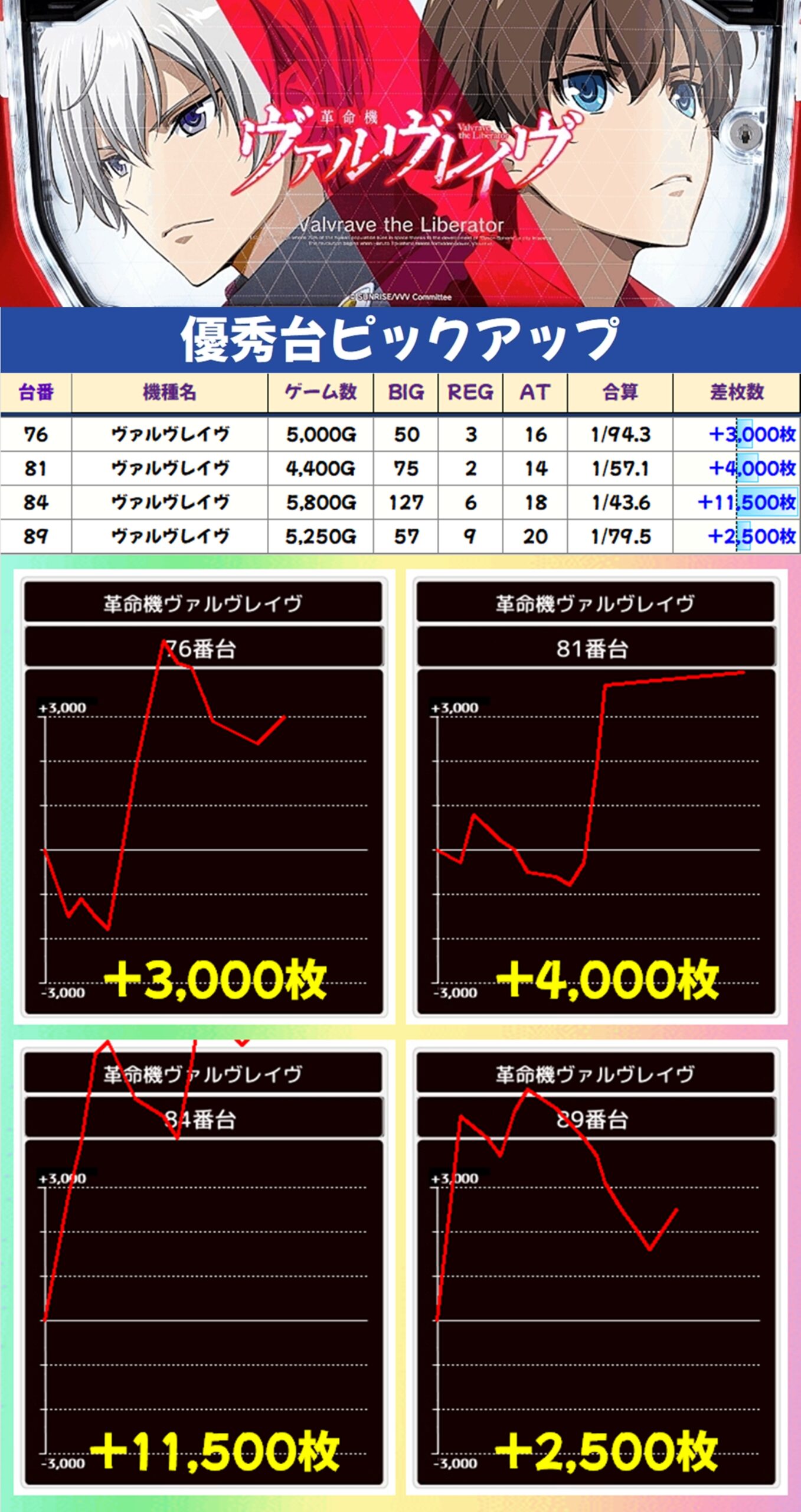 ヴァルヴレイヴからは+11500枚の万枚オーバーが出現!その他+4000枚や+3000枚の出玉も!