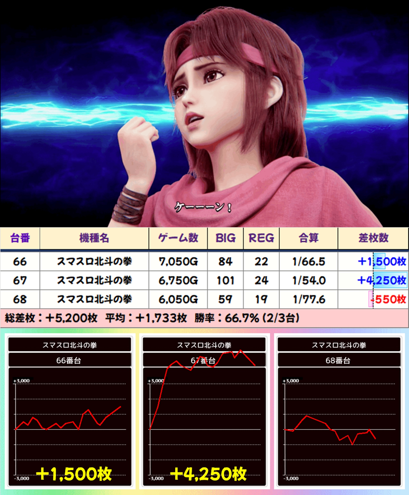 【3台並び】スマスロ北斗の拳(66-68番台)→平均+1,733枚