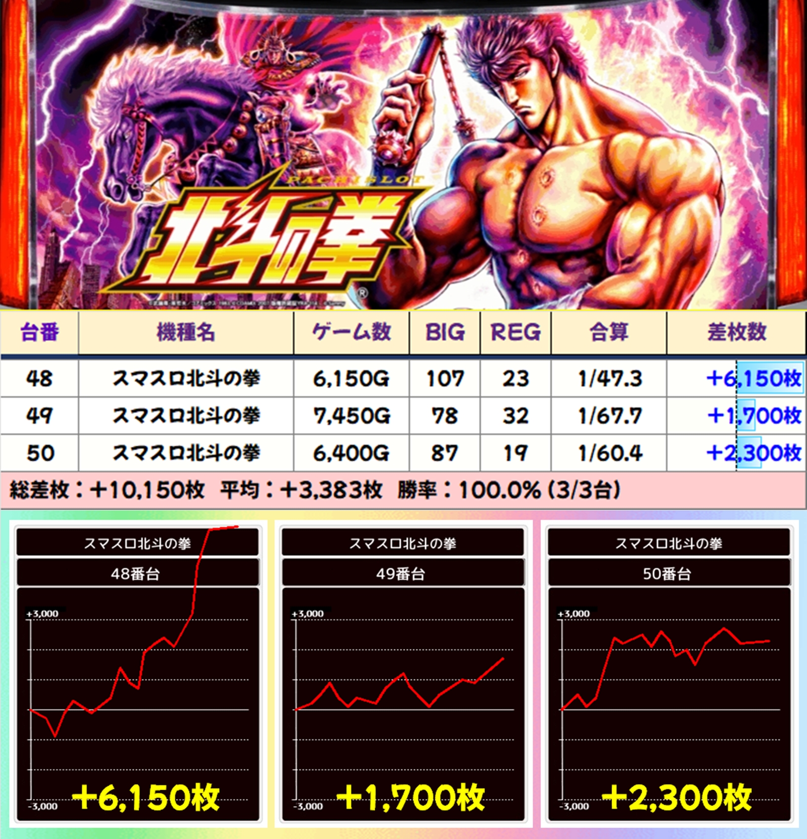 【3台並び】スマスロ北斗の拳(48-50番台)→平均+3,383枚
