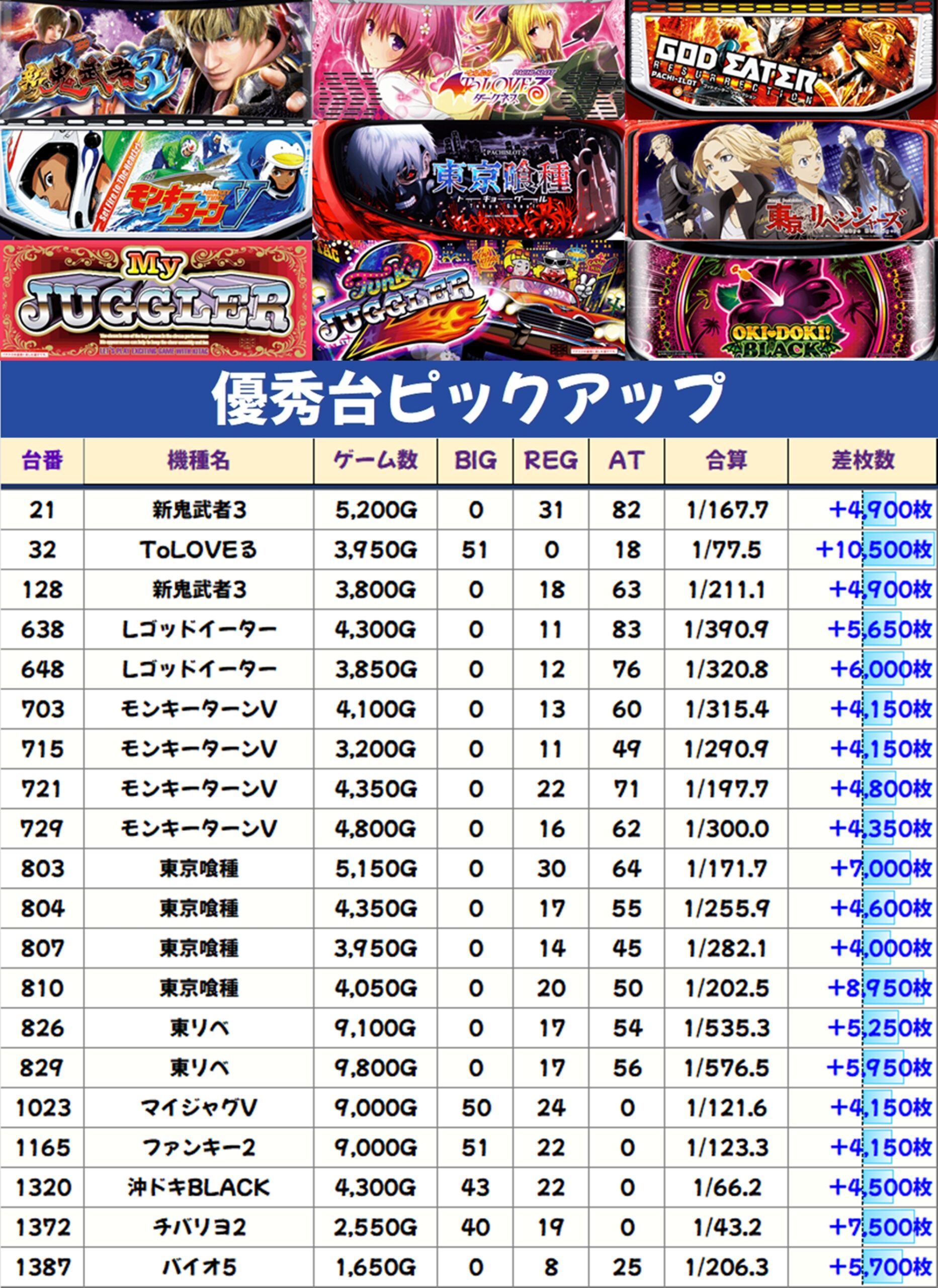 各機種の優秀台をピックアップしていますのでデータを確認してみましょう!