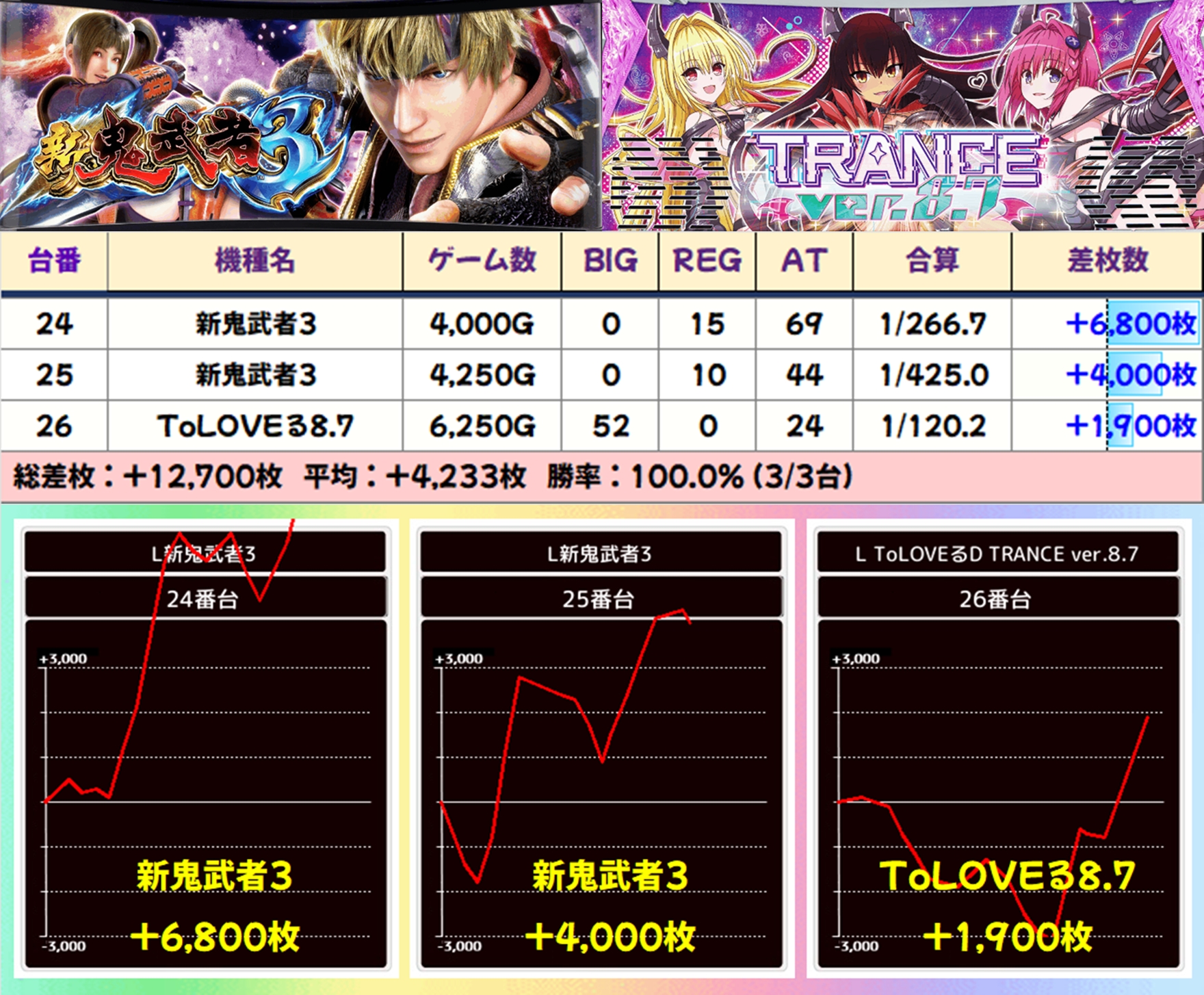 【3台並び】新鬼武者3・ToLOVEる8.7(24-26番台)→平均+4,233枚