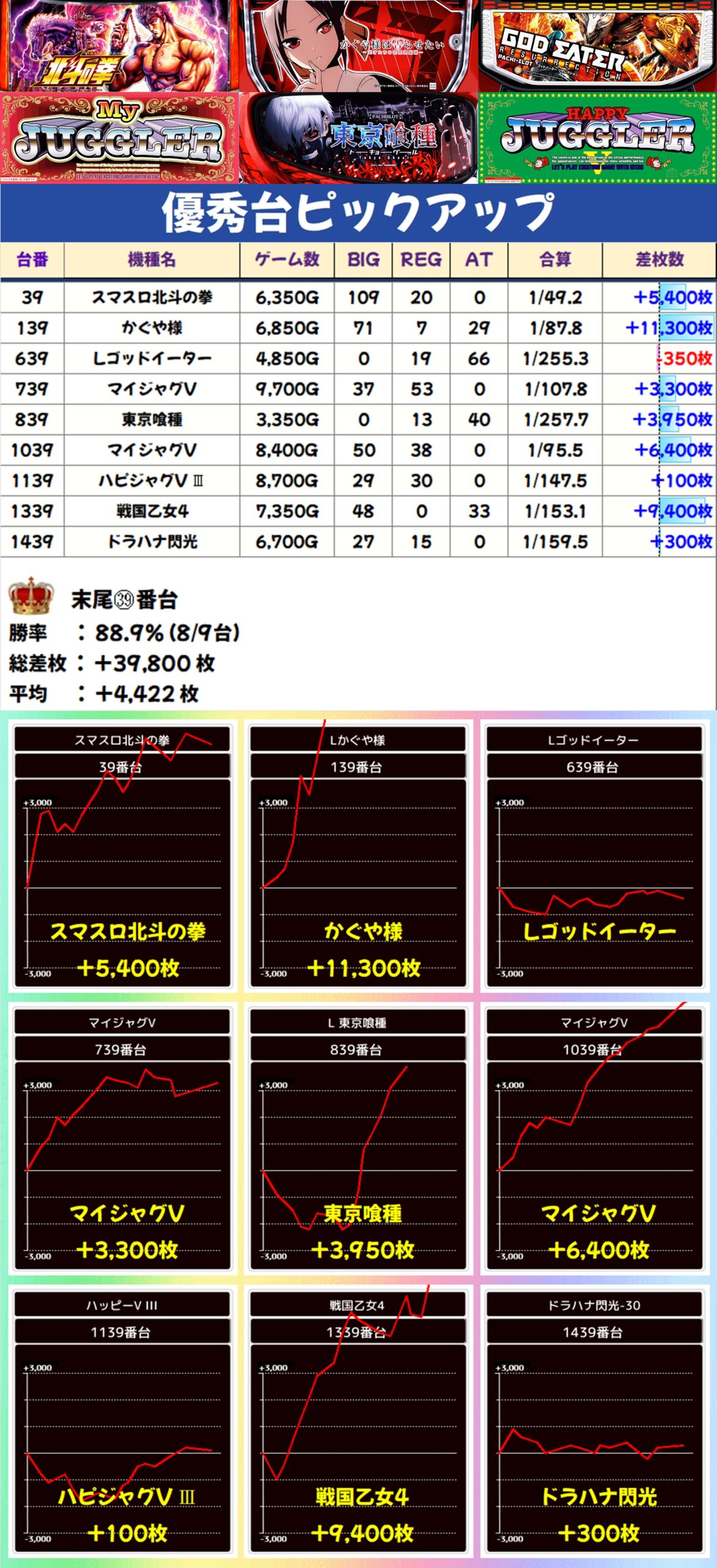 前回の39の日と同様に今回も末尾㊴番台に仕掛けがあり、平均+4422枚の見事な好成績を記録することに!かぐや様から11300枚など大量出玉も多数確認することができました。