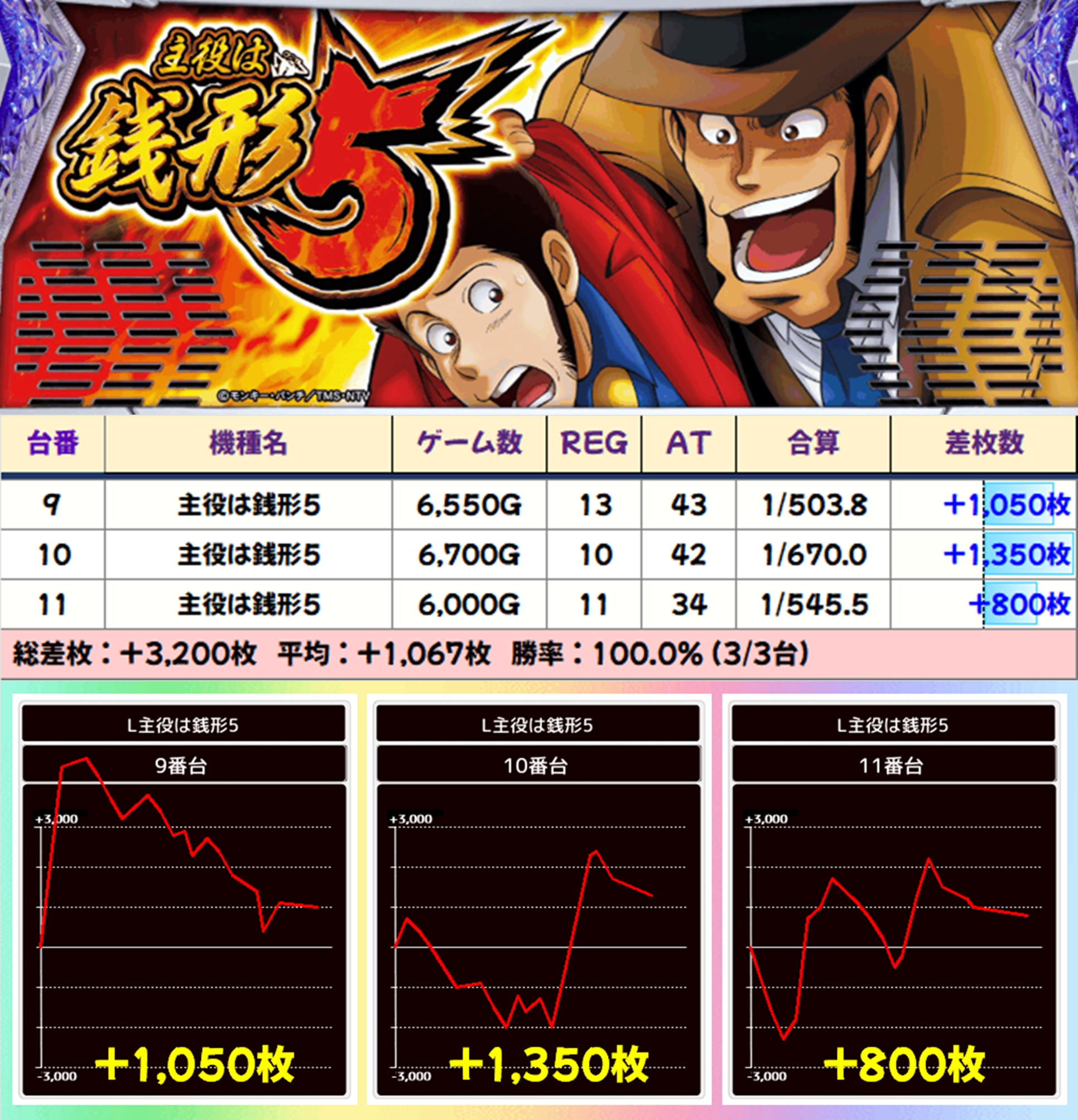 【3台並び】主役は銭形5(9-11番台)→平均+1,067枚