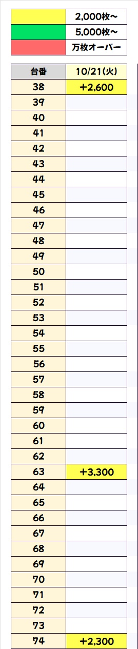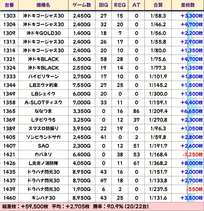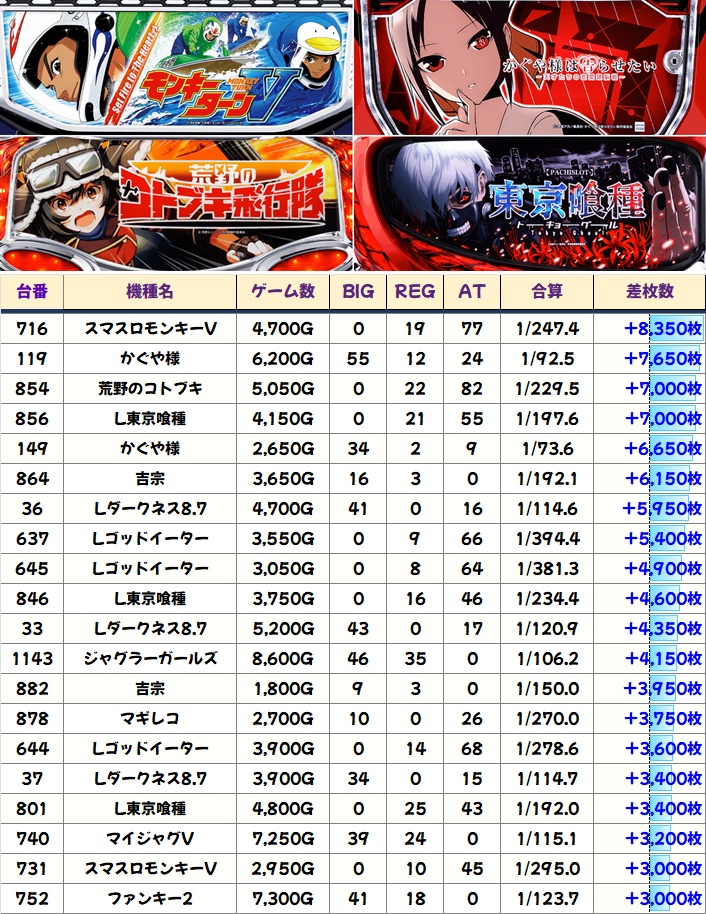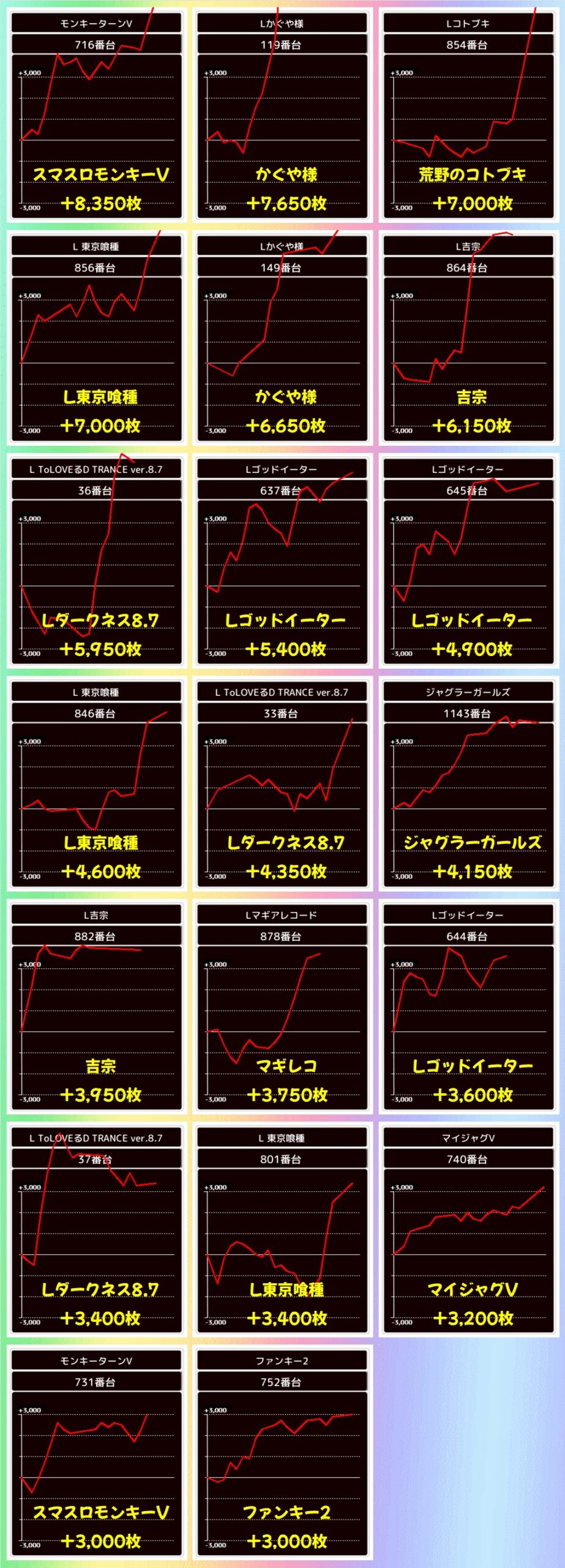 今回も各機種の優秀台(+2000枚以上)をピックアップしていきますので、データをチェックして明日以降の参考にしてください!