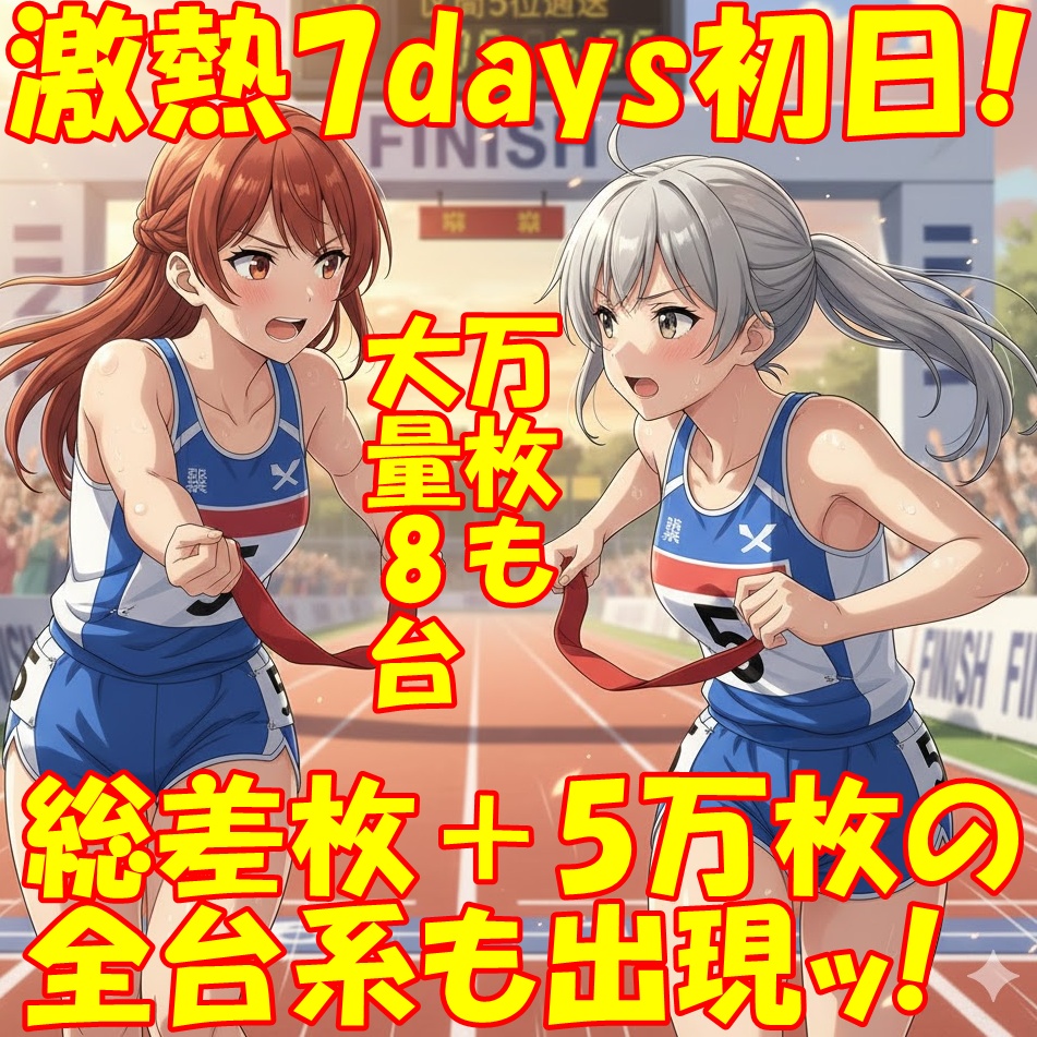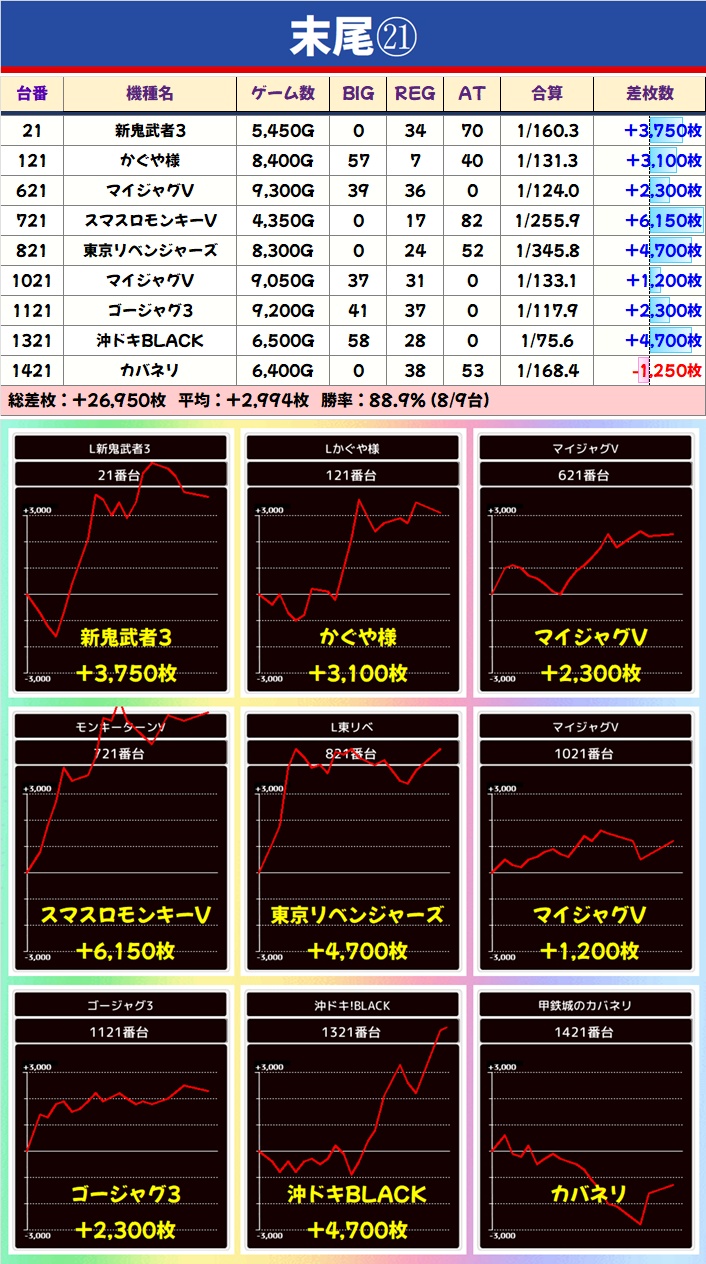 『激熱7days』の期間中は日付末尾が強くなるのが特徴となっており、今回も末尾㉑が平均+約3000枚、勝率88.9%(8/9台)と素晴らしい結果に!