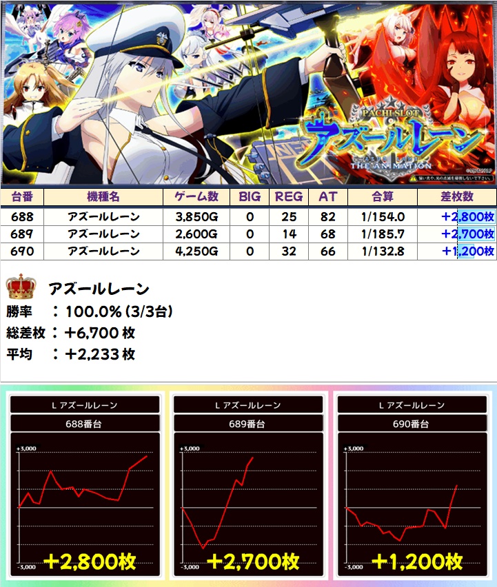 3台設置の「アズールレーン」は、複数の+2500枚以上など全台大幅なプラスで平均+2233枚と安定の好結果に!