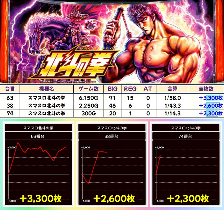 「スマスロ北斗の拳」は+3300枚など計3台が+2000枚を突破!
