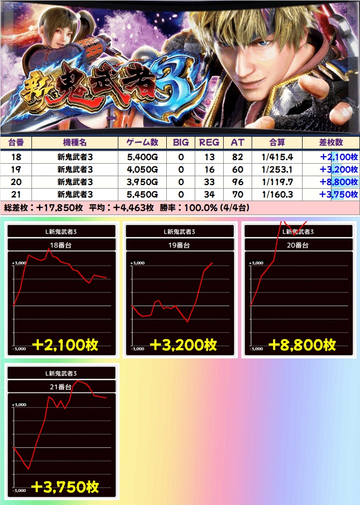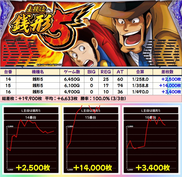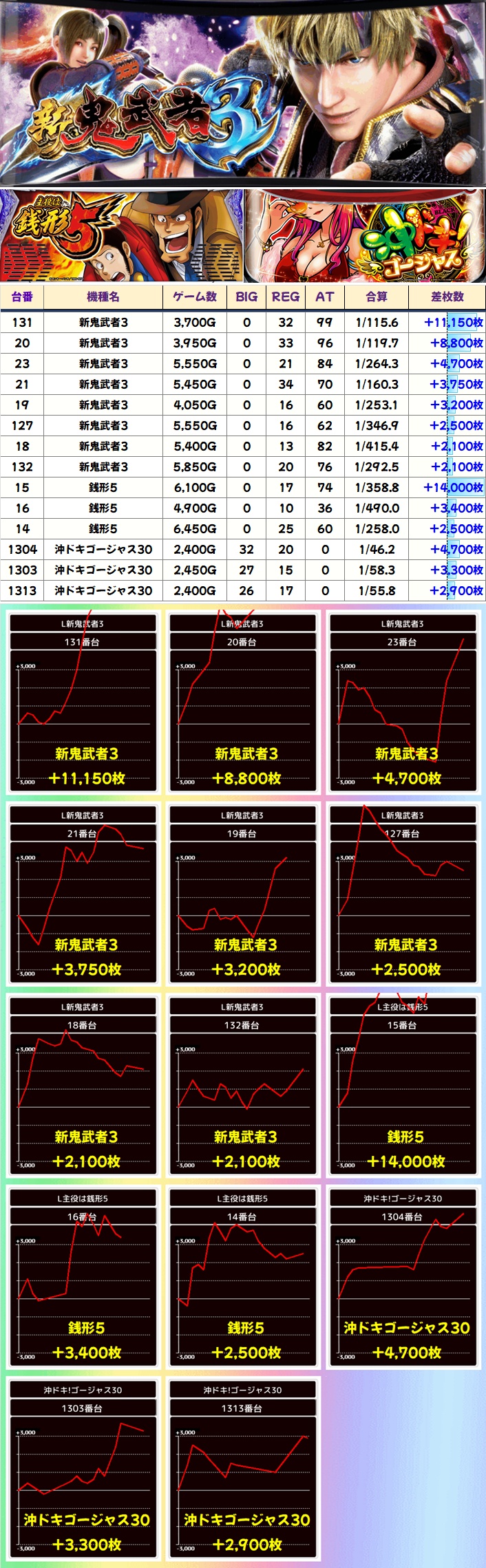 「新鬼武者3」には+11150枚、「銭形5」には14000枚と両機種から万枚を筆頭に多数の優秀台を確認!