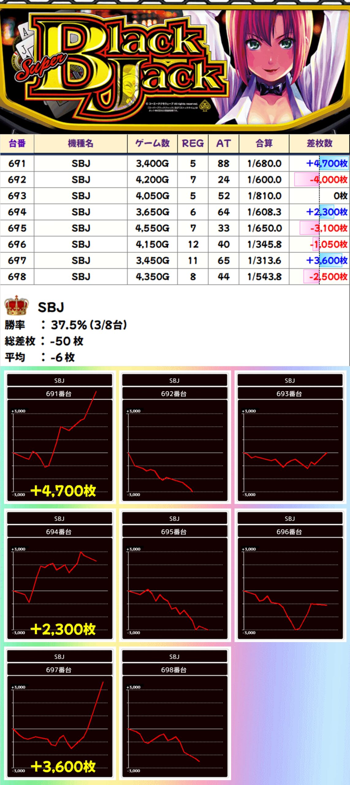 かぶぱポストにヒントがあったSBJは残念ながら不発の台が多く見られる結果に…。それでも。プラスとなった台は、+4700枚、+3600枚、+2300枚とまとまった出玉を獲得しておりました。