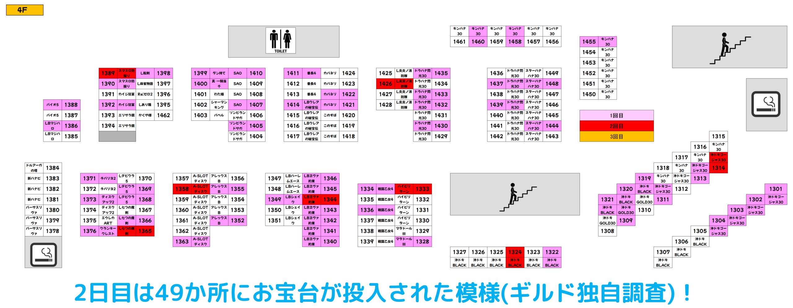 過去の傾向として、27日までは対象フロアでのお宝台の大量投入に期待できますので、明日以降は積極的に4Fフロアを狙ってみるのも手ですね。