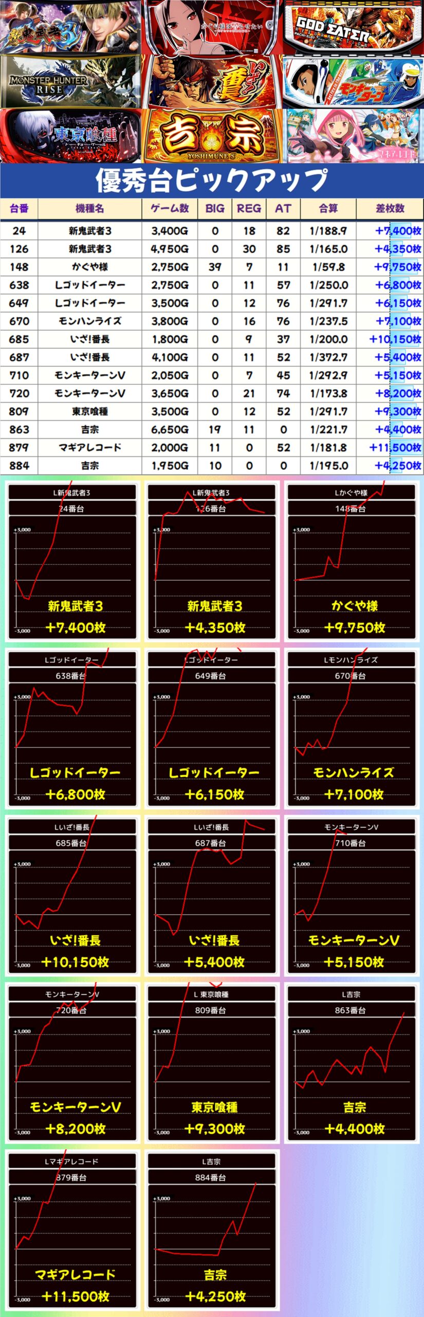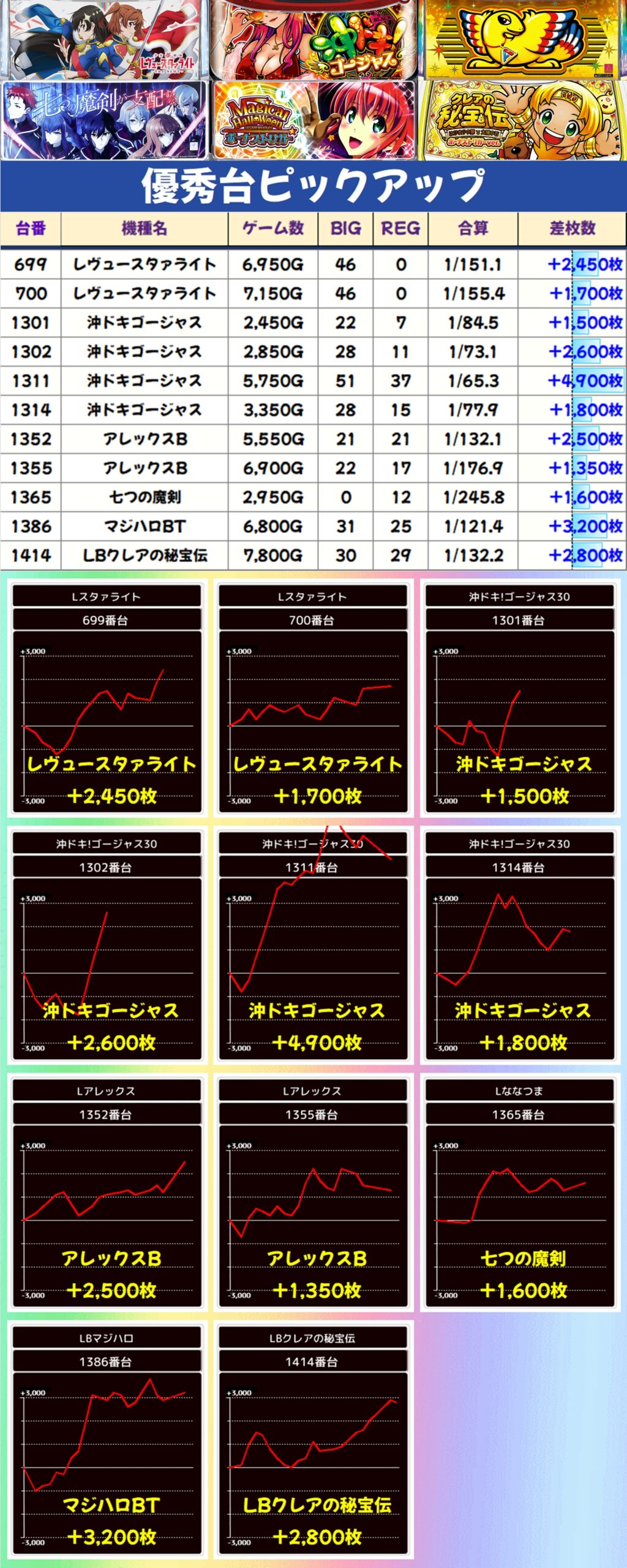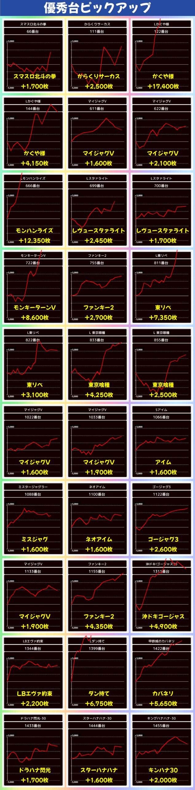 各機種の優秀台(+2000枚以上)をピックアップしていきますので、データをチェックして明日以降の参考にしてください!