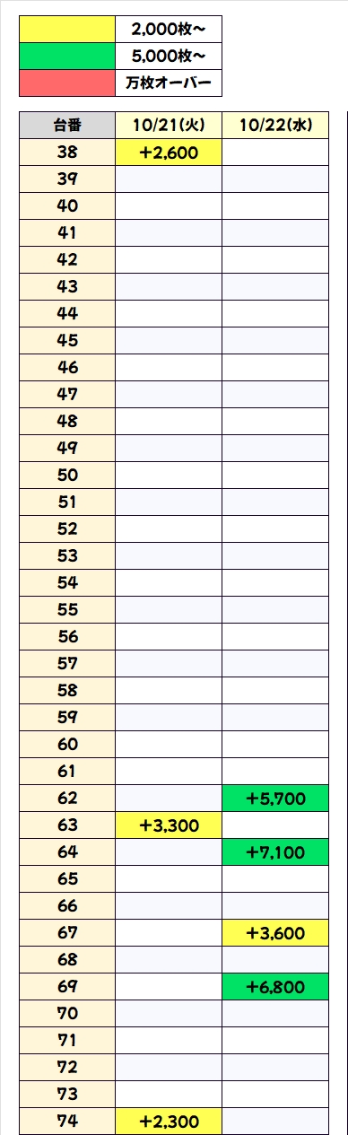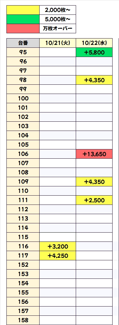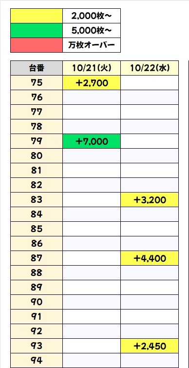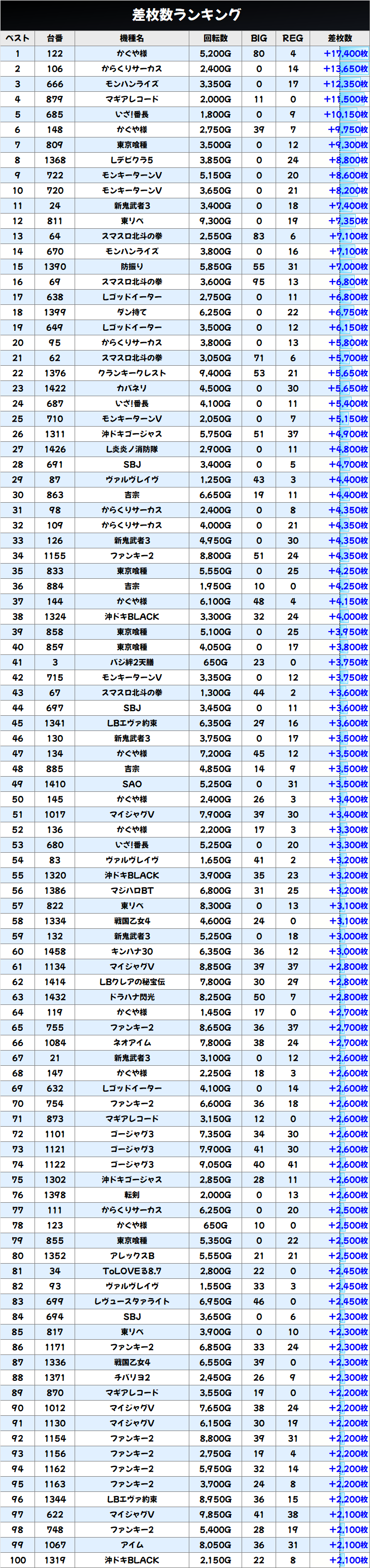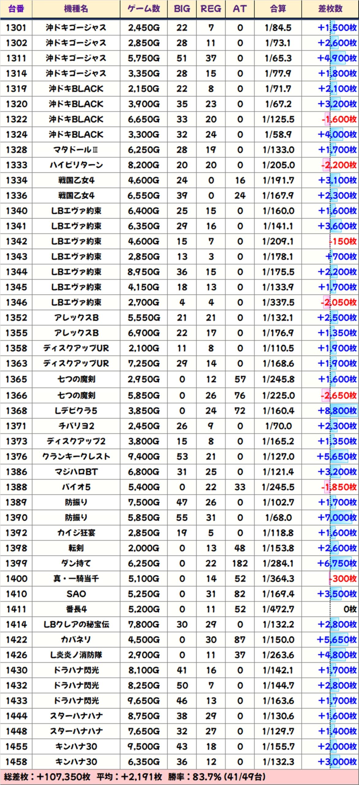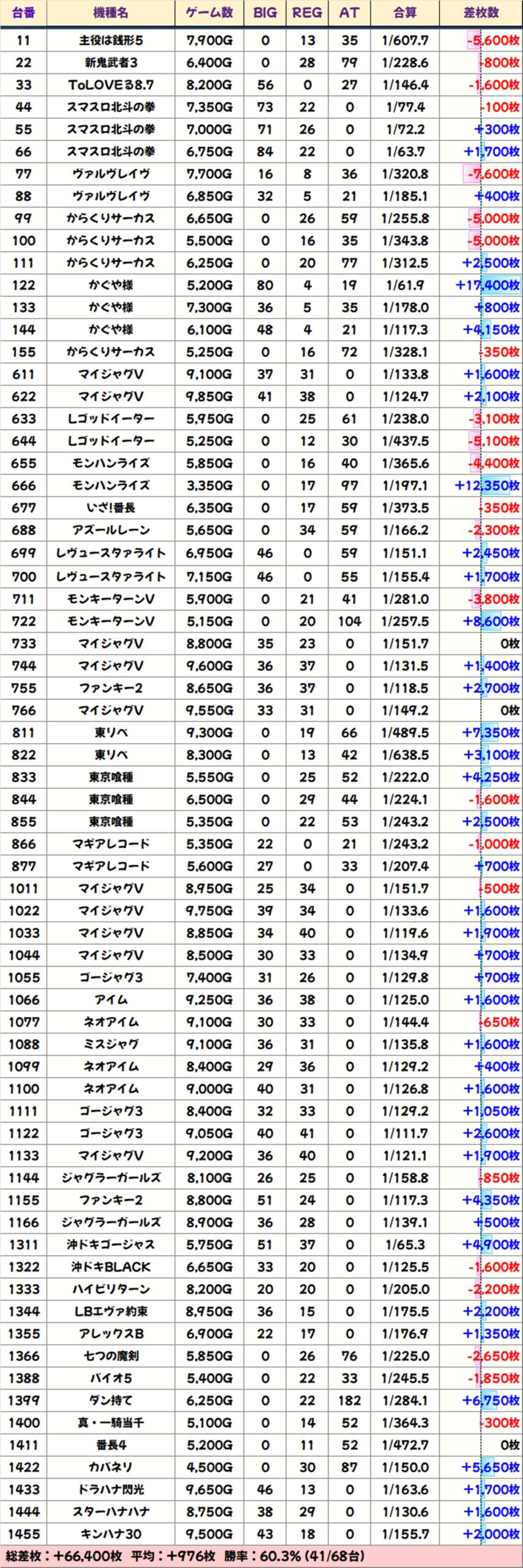 各機種の優秀台(+2000枚以上)をピックアップしていきますので、データをチェックして明日以降の参考にしてください!