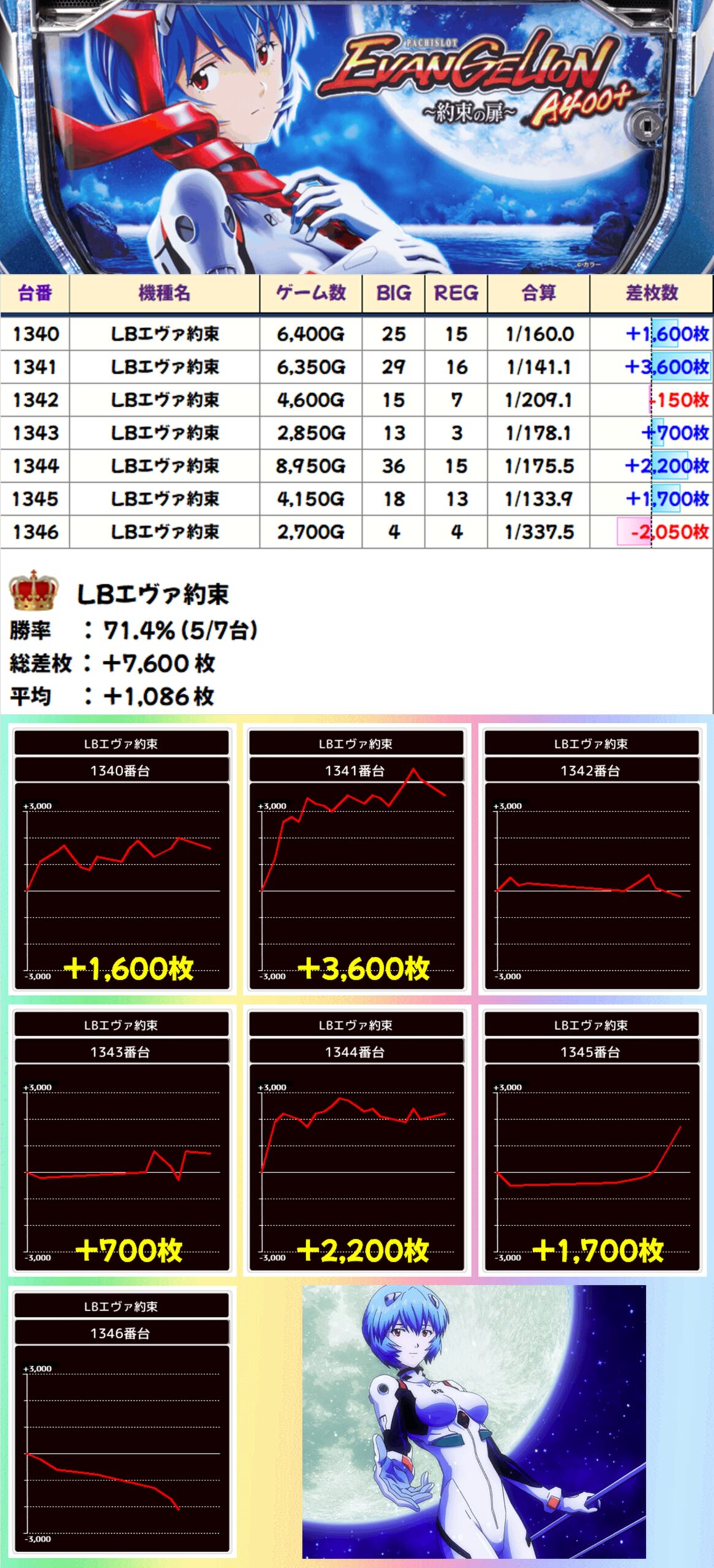LBエヴァ約束からは+3600枚や+2200枚の優秀な出玉を確認。少々打ち込みが弱かった台や不発の台も見られましたが、平均では+1000枚を超える結果となりました。