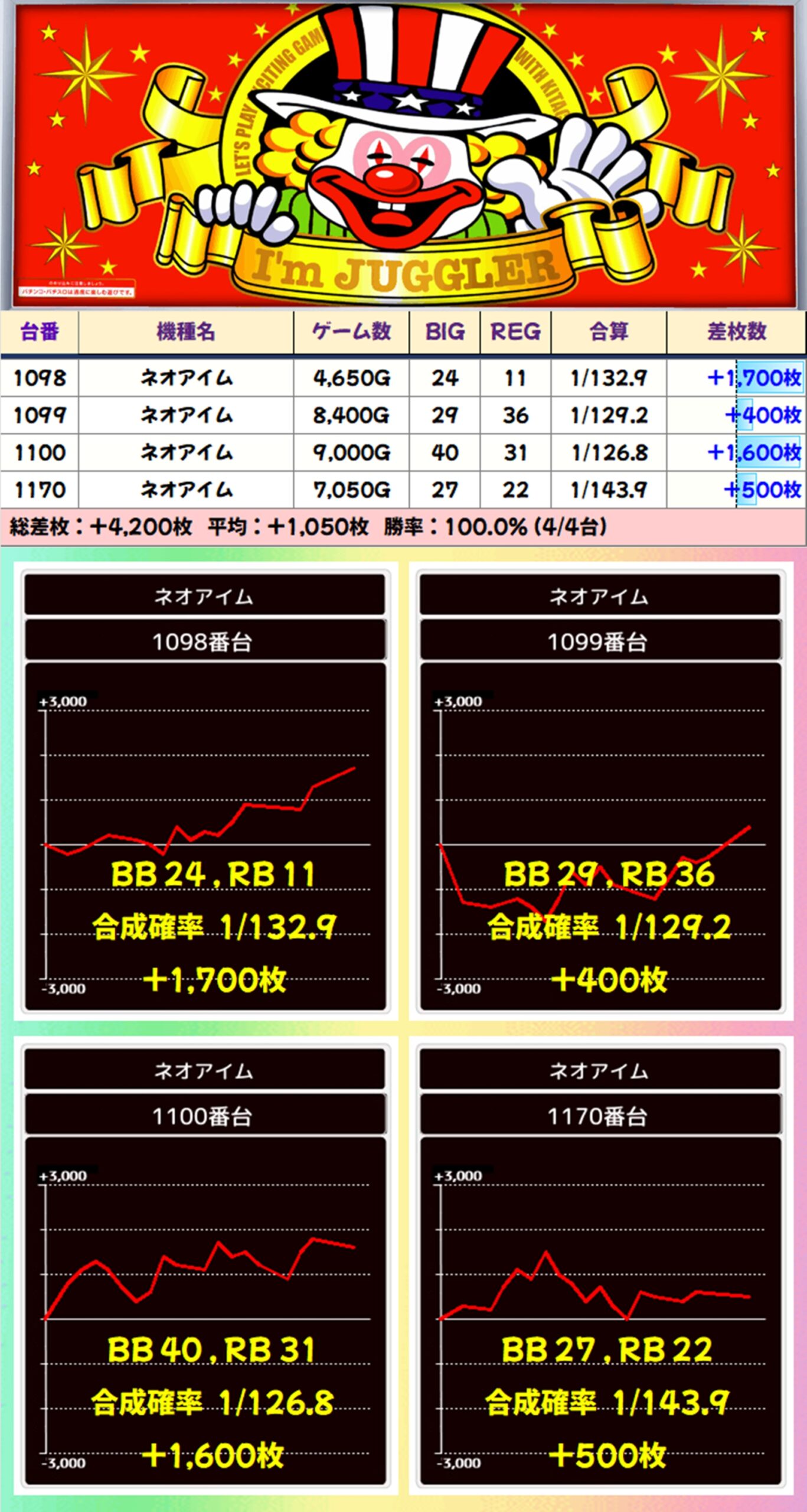 【4台並び】ネオアイム(1098-1100・1170番台)→平均+1,050枚