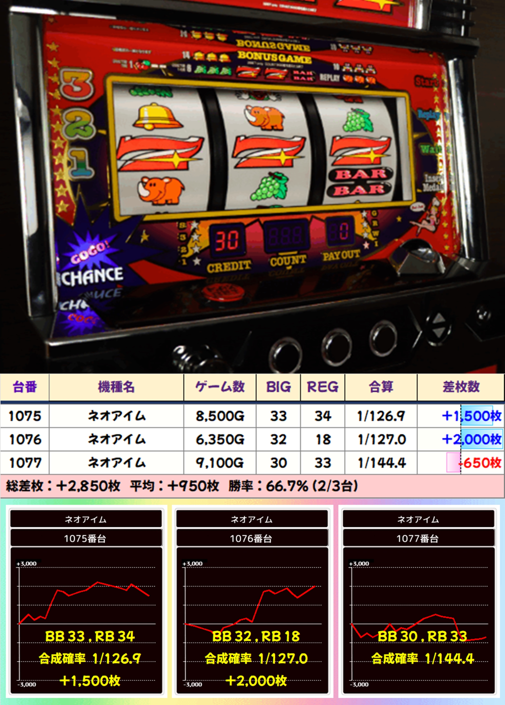【3台並び】ネオアイム(1075-1077番台)→平均+950枚