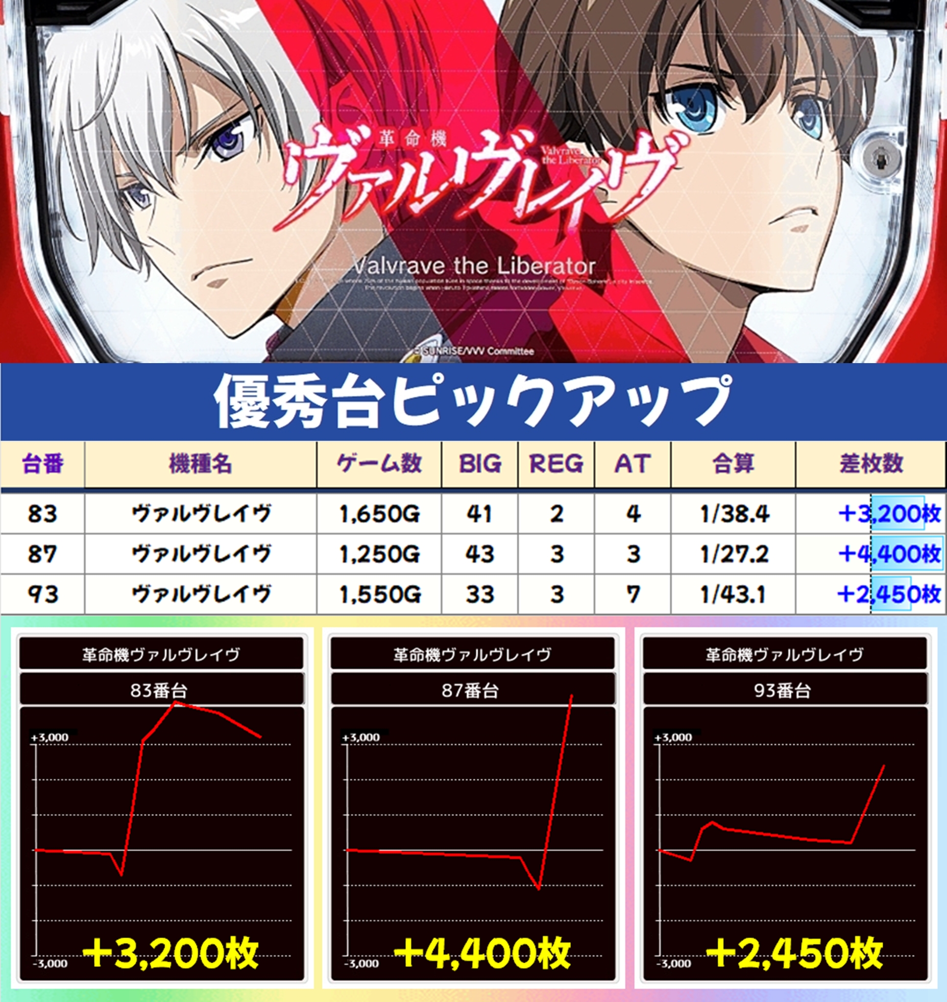 ヴァルヴレイプからは+4400枚、+3200枚、+2450枚の出玉を確認できました!