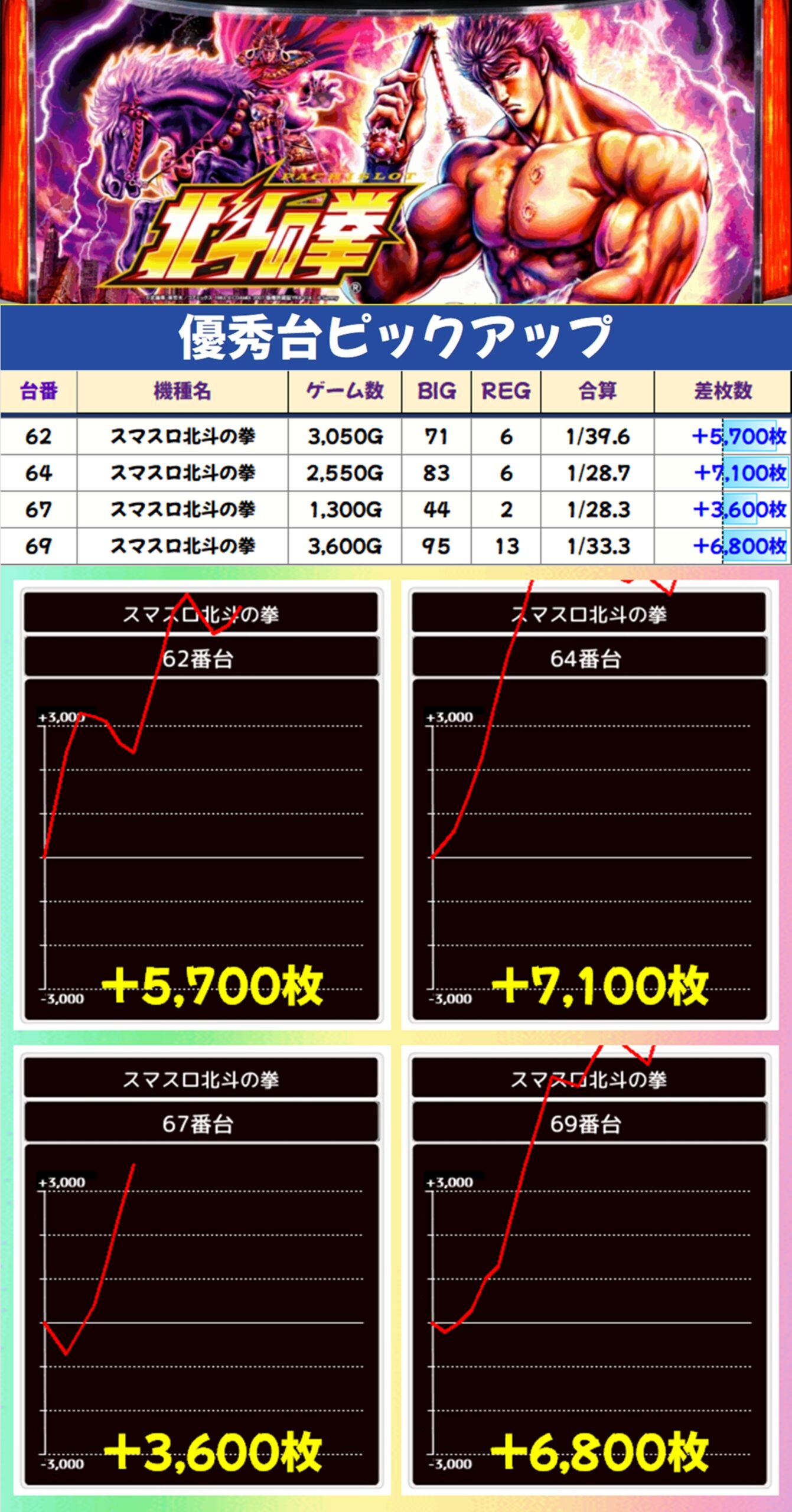 スマスロ北斗の拳からは+7100枚を筆頭に大量出玉が4台出現!