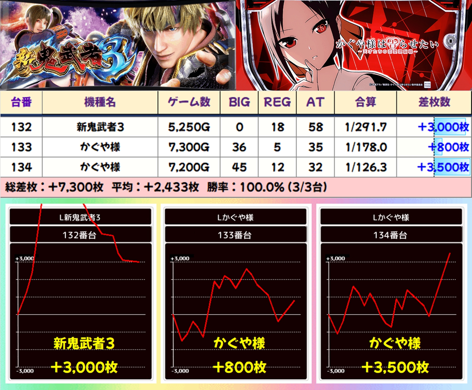 【3台並び】新鬼武者3・かぐや様(132-134番台)→平均+2,433枚