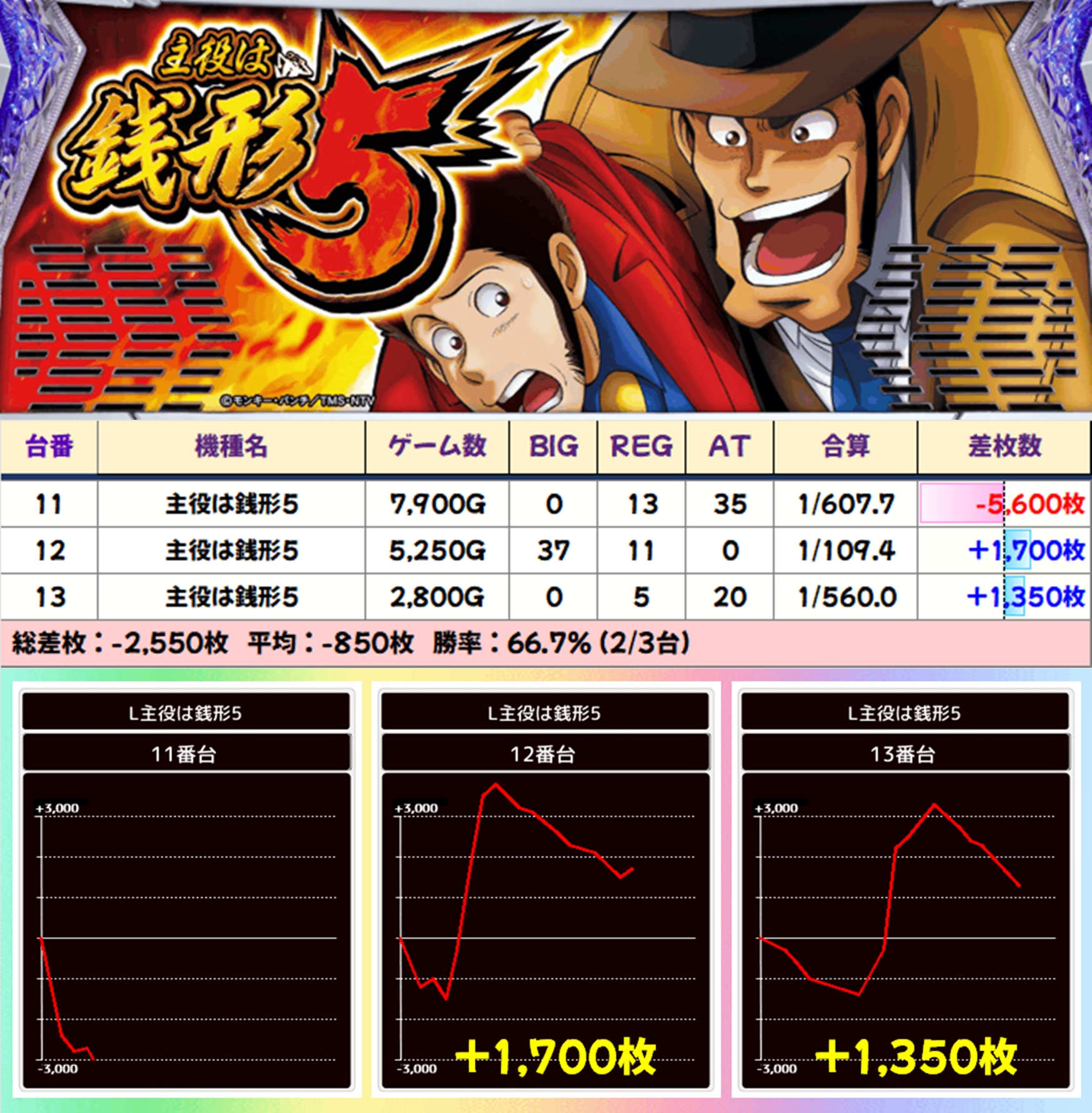 今回は残念ながら大きくマイナスとなってしまった台があった主役は銭形5もゾロ目の日に連続で仕掛けが出現しております。ちなみに、主役は銭形5は前日も並びの仕掛けがありましたね!
