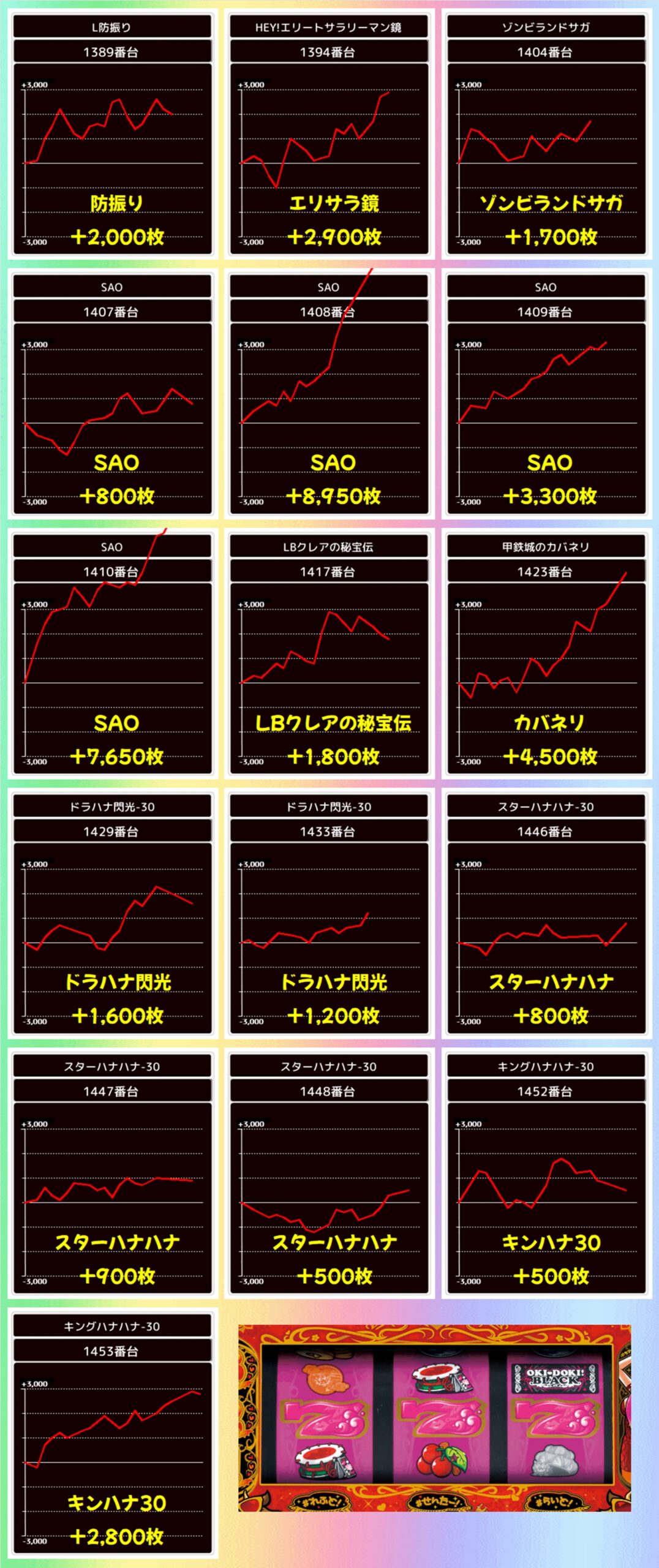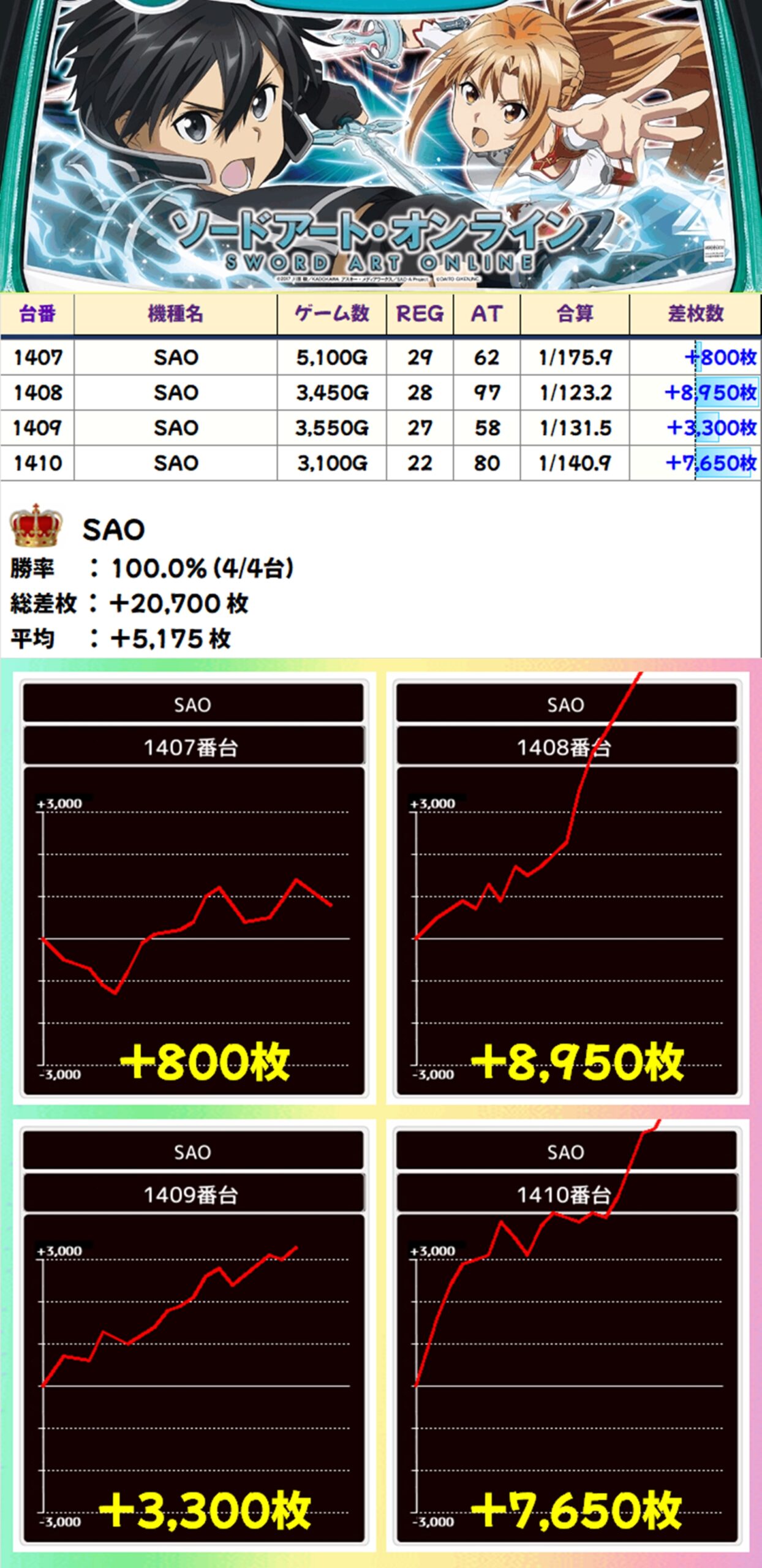 激熱7daysの対象フロアにあるSAOも全台系濃厚で、+8950枚や+7650枚などにより、平均はなんと+5000枚を突破!
