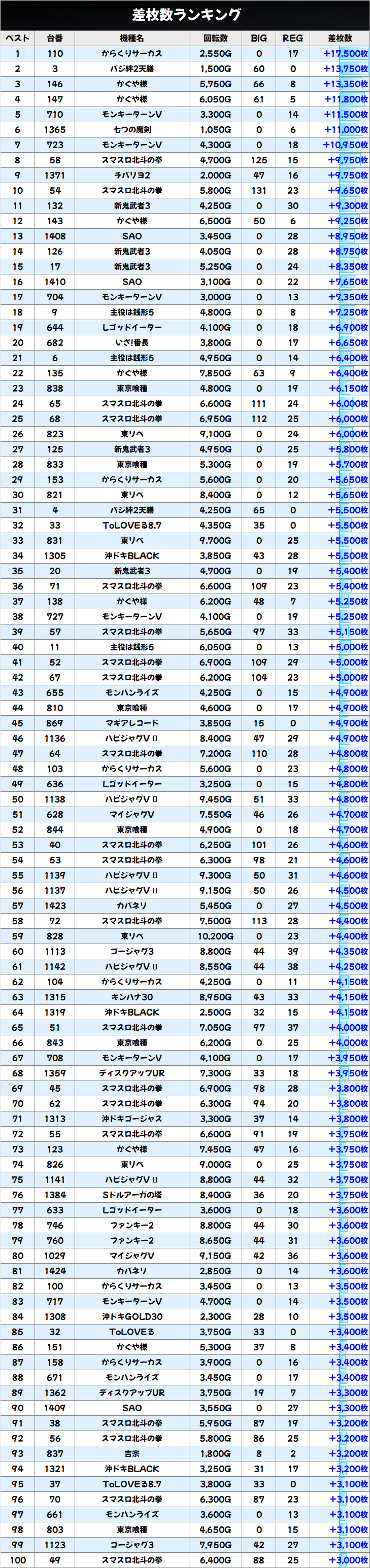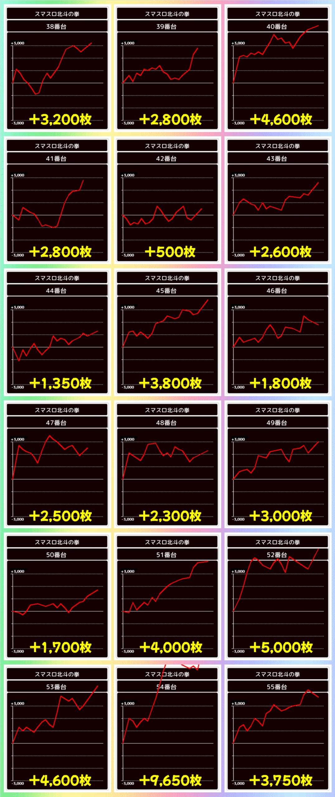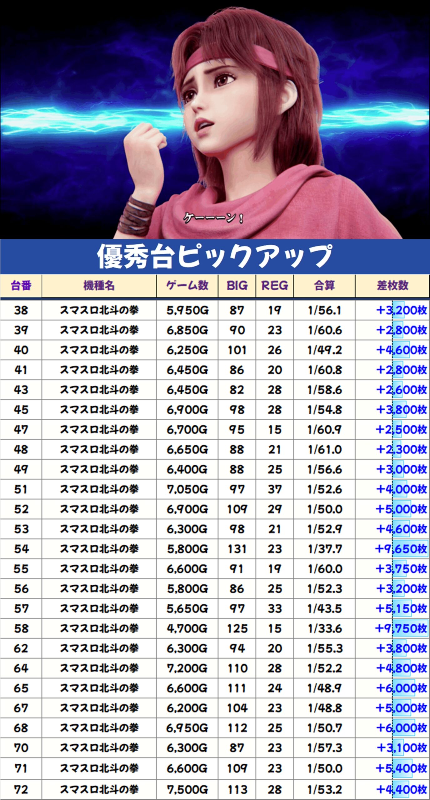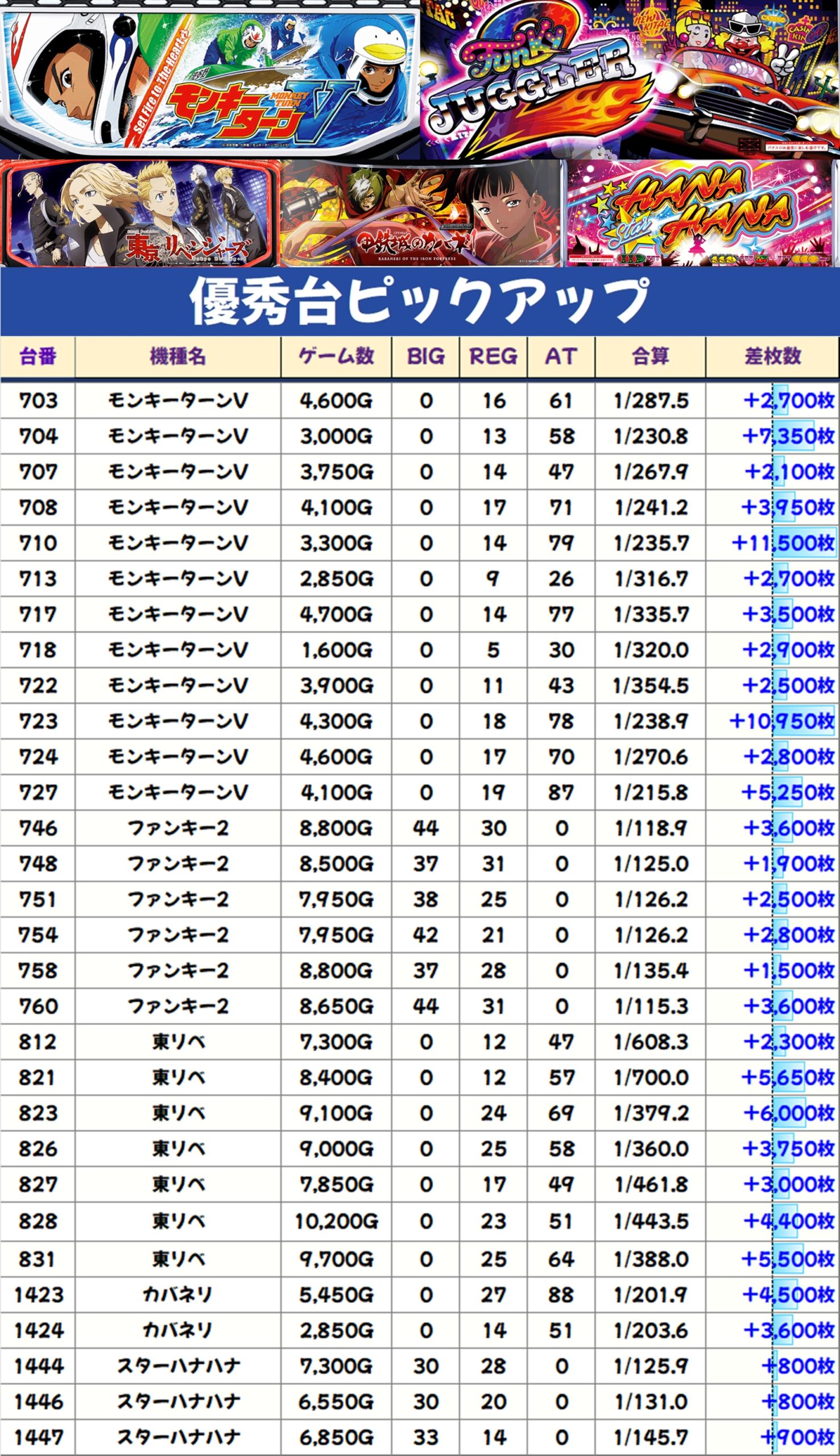 今回はスマスロ北斗の拳が全台系濃厚となっておりましたが、ここでは改めて優秀台(+2000枚以上)としてピックアップしていきます。各機種のデータをチェックして明日以降の参考にしてください!