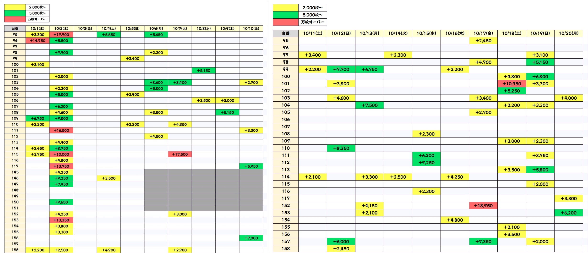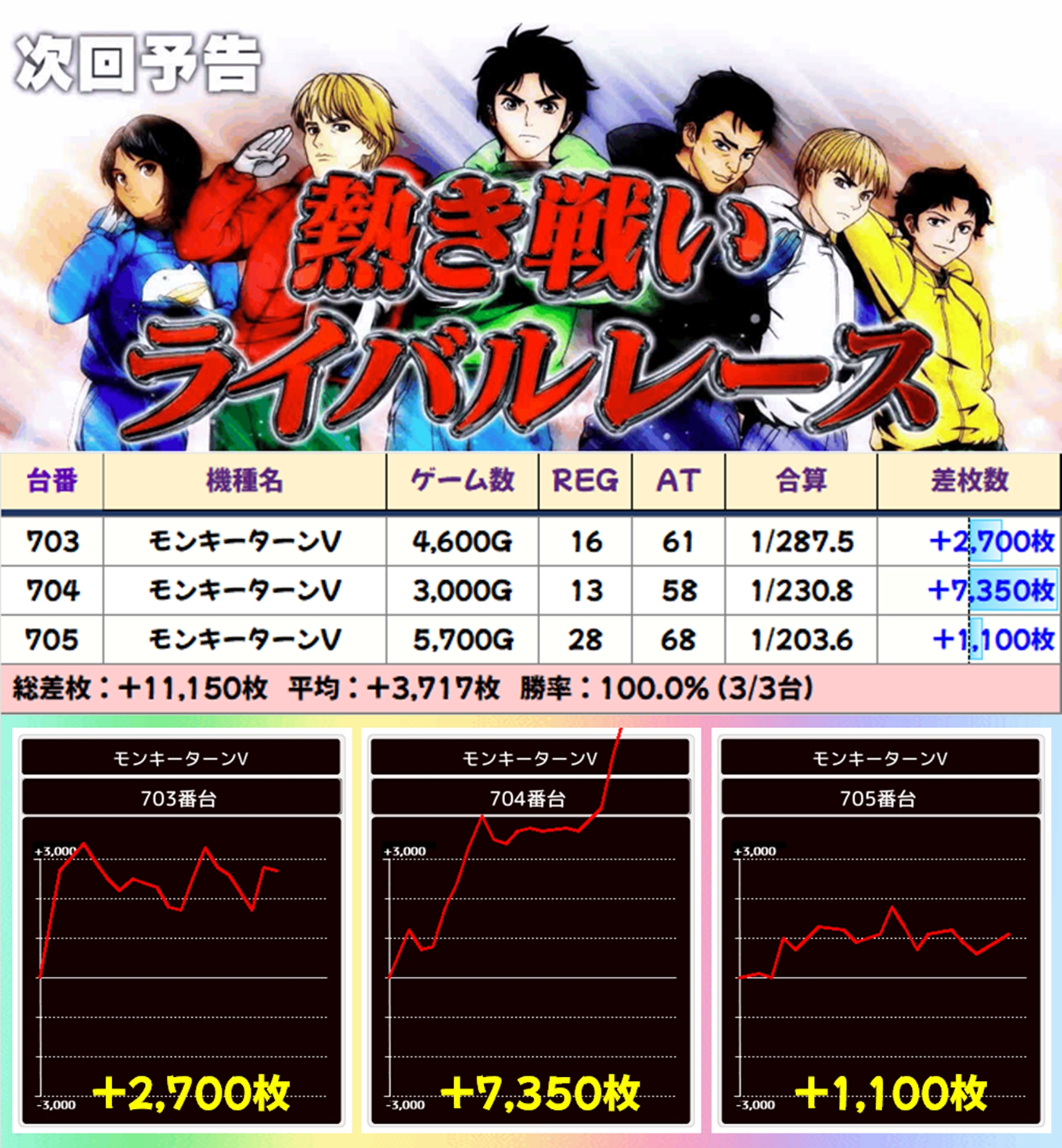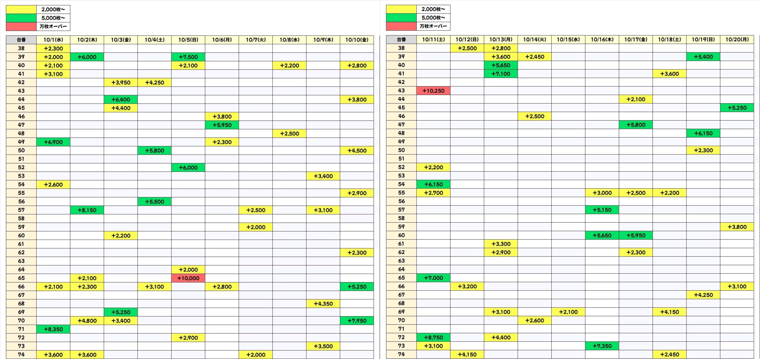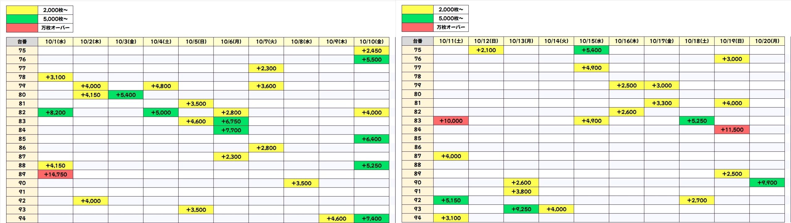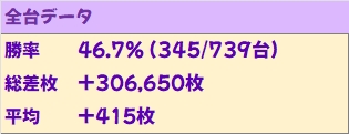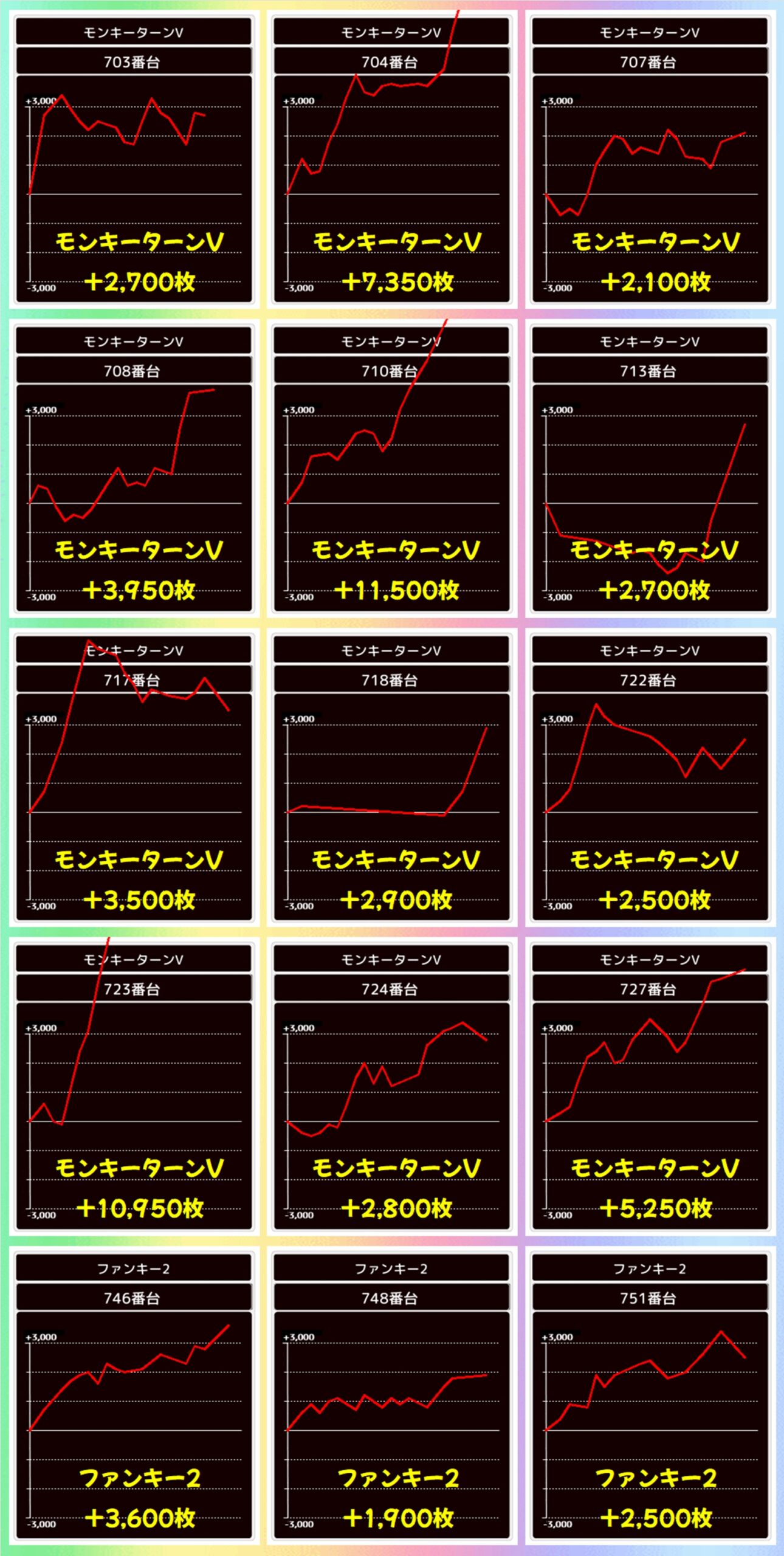 今回の月イチ周年日は総差枚が+30万枚を突破!平均差枚は+415枚となりました!この結果はこれまでの月イチ周年日と比較してもトップクラスの好成績と言えますね!