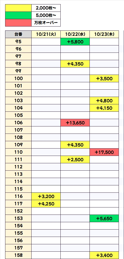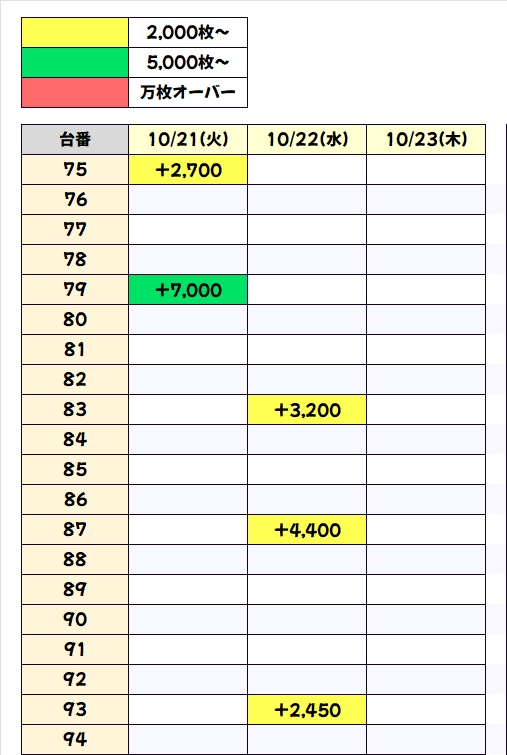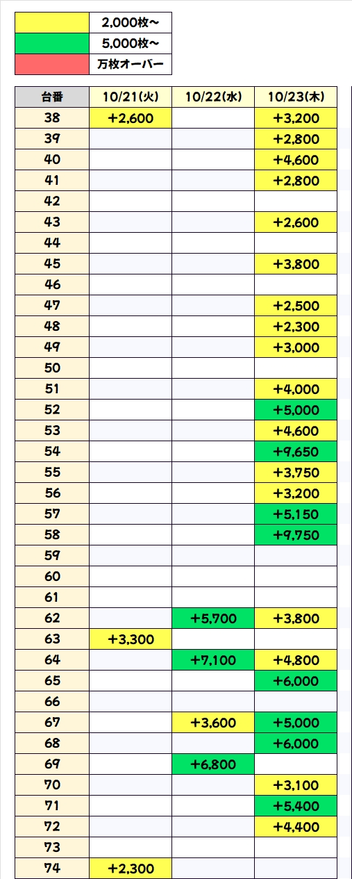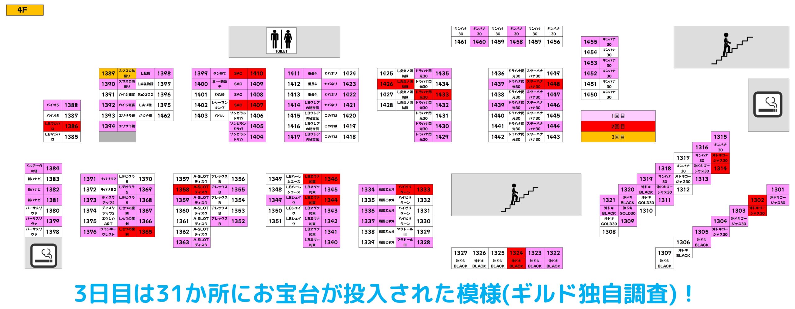 過去の傾向として、27日までは対象フロアに大量のお宝台に期待できますので、明日以降も積極的に4Fフロアを狙ってみるのもアリですね!