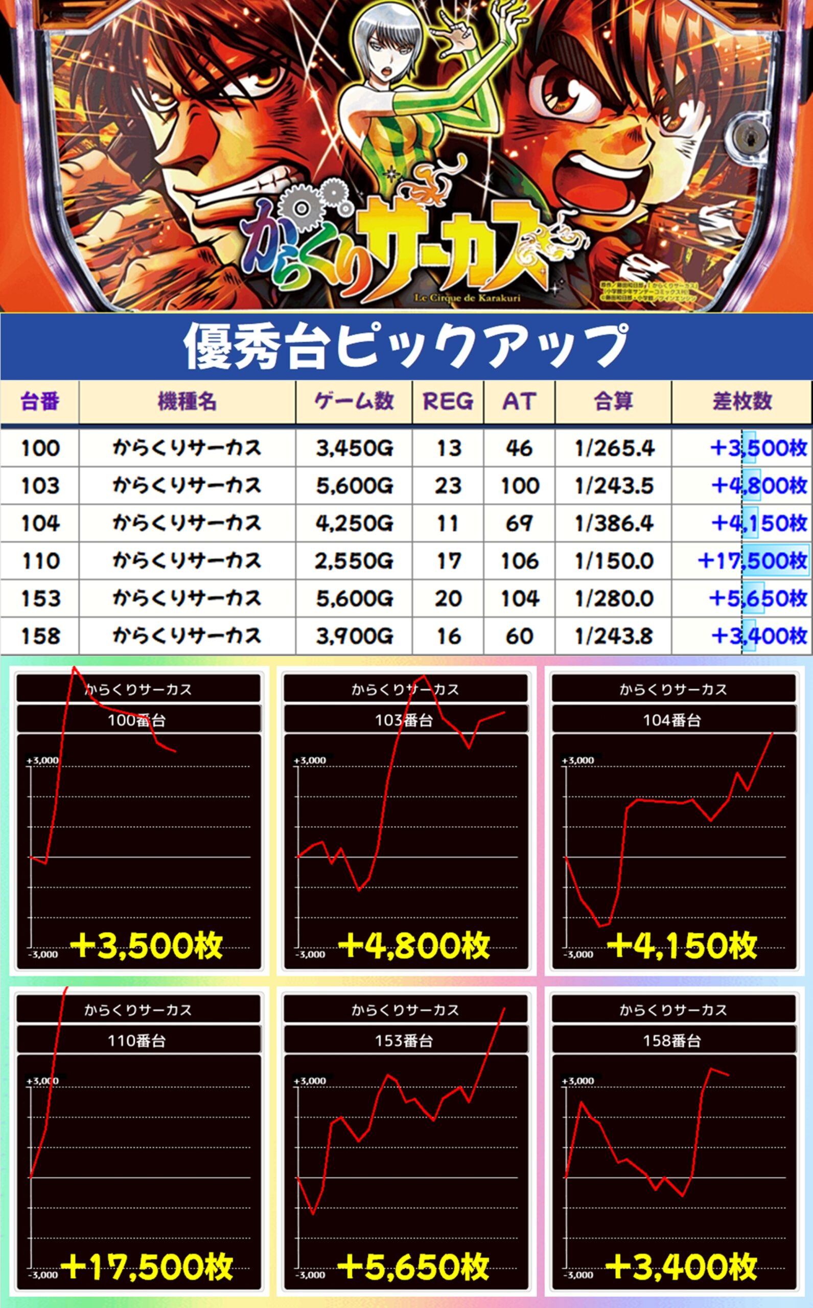 からくりサーカスからは+17500枚の驚異的な爆裂台が出現。その他にも大量出玉を多数確認!