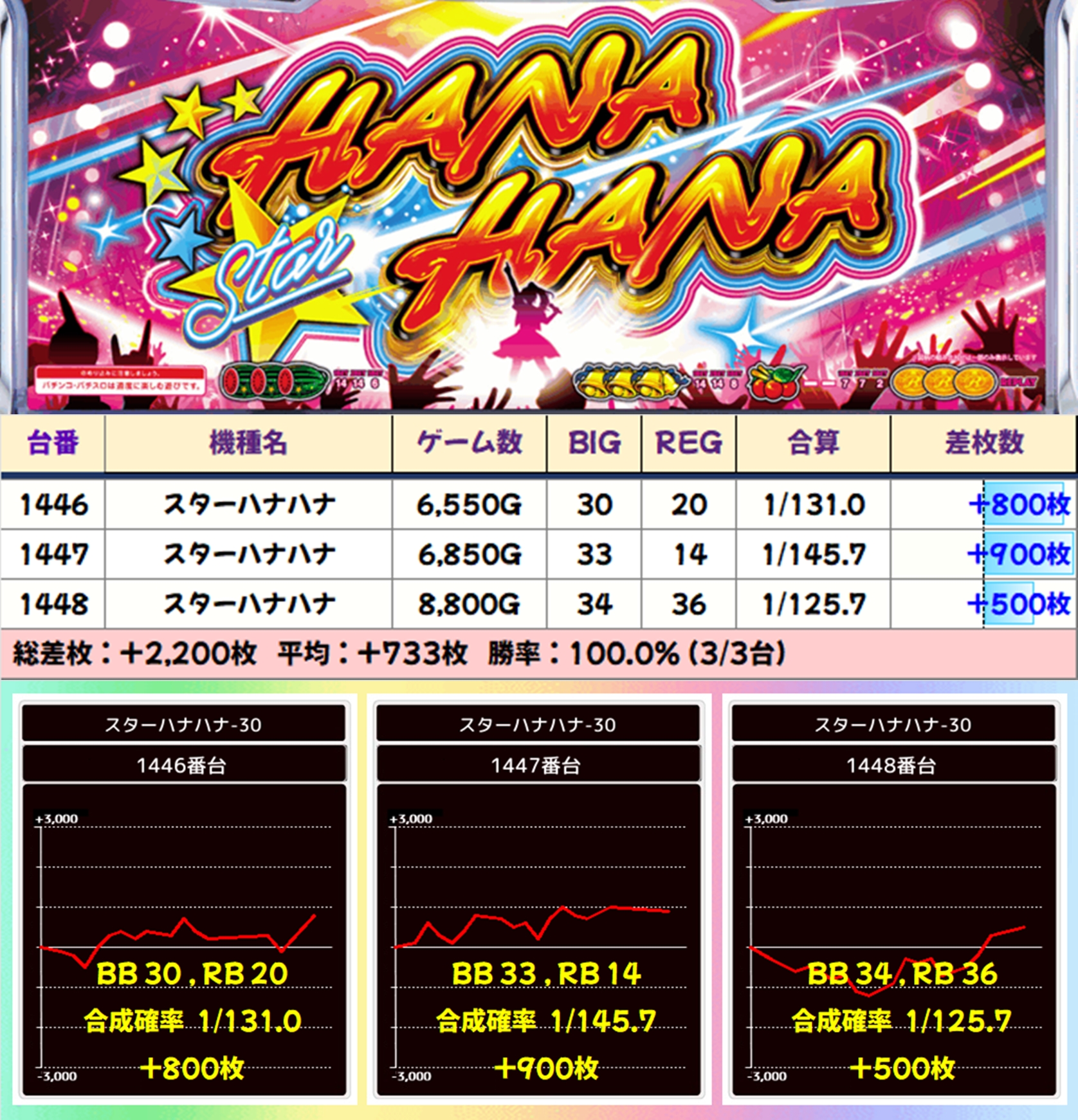 【3台並び】スターハナハナ(1446-1448番台)→平均+733枚