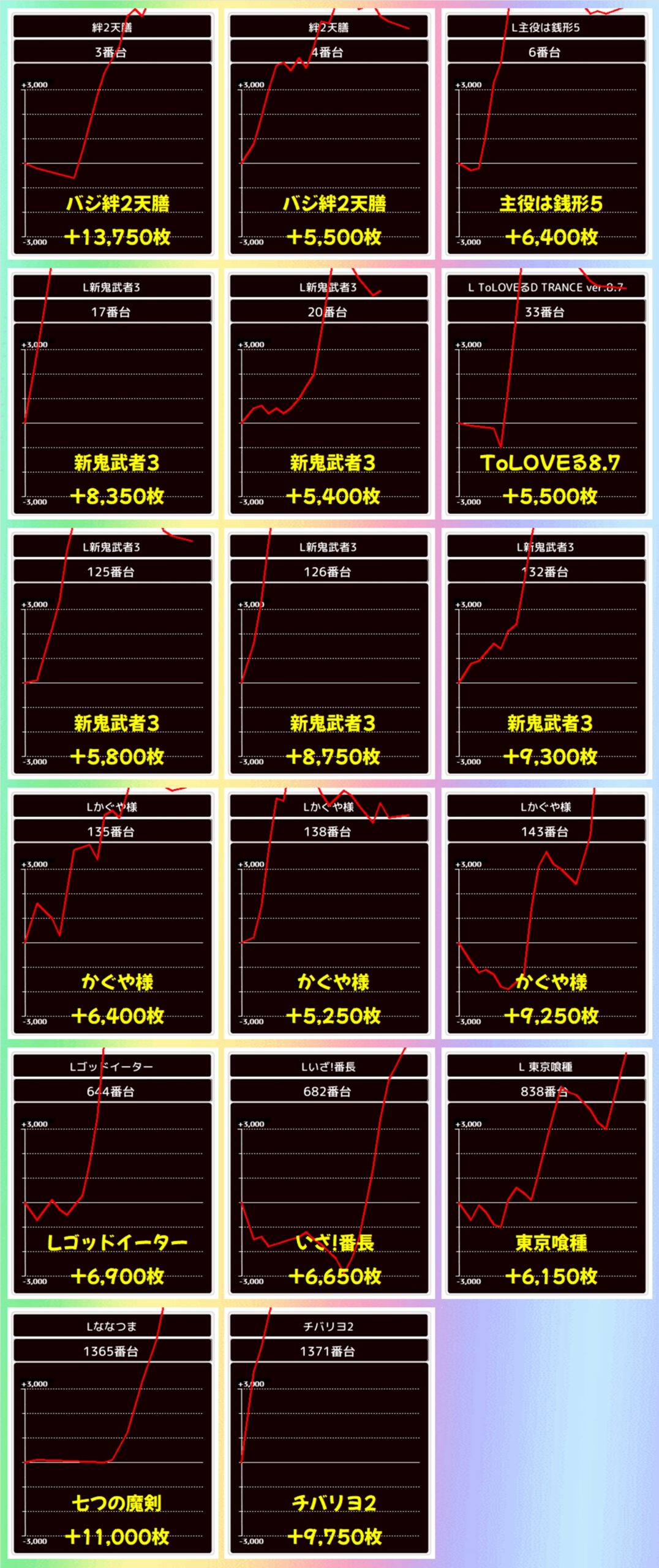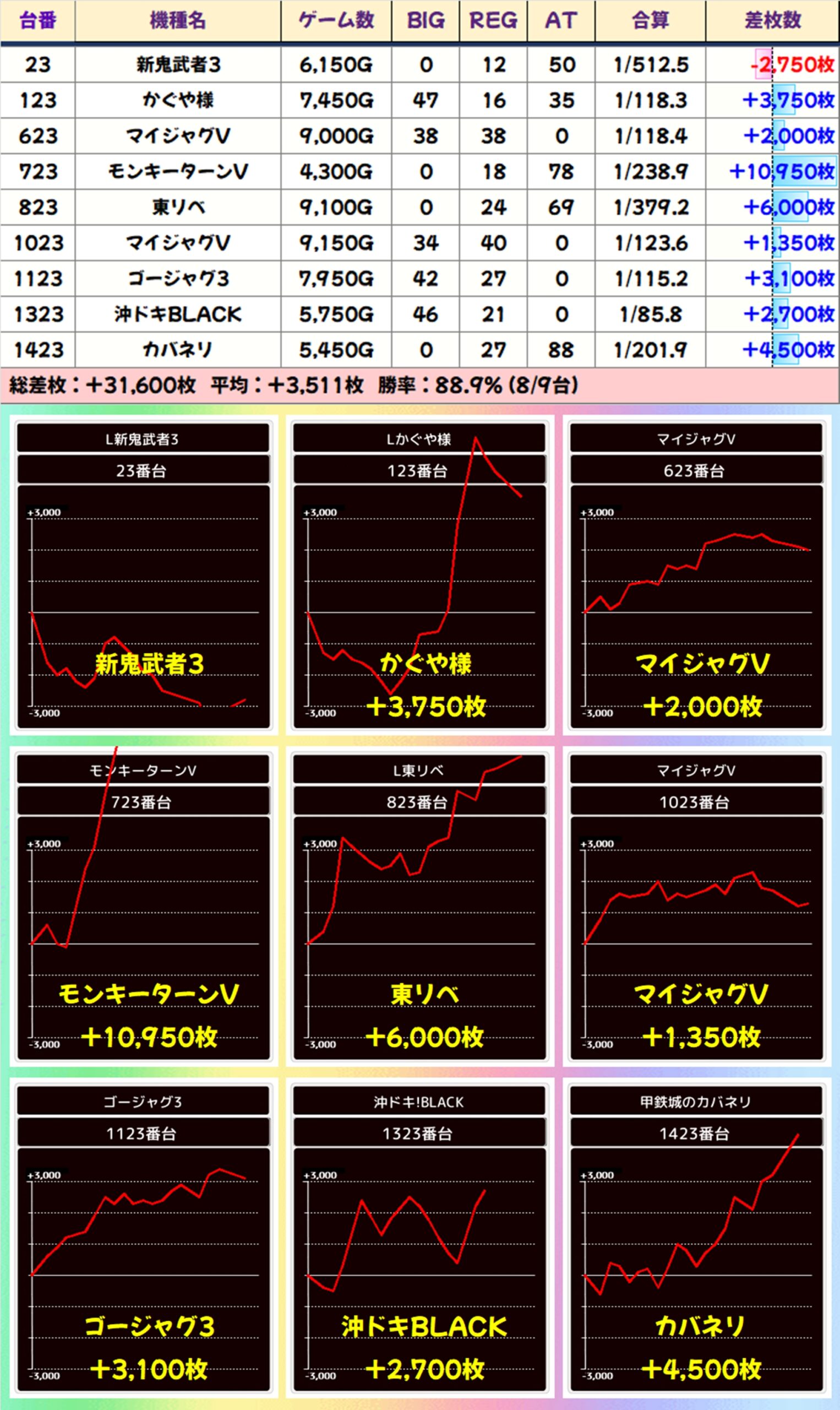 今回も末尾㉓番台から大量出玉を確認できました。残念ながら新鬼武者3の1台が不発でしたが、末尾㉓番台の平均は+3511枚と好成績を収めました!