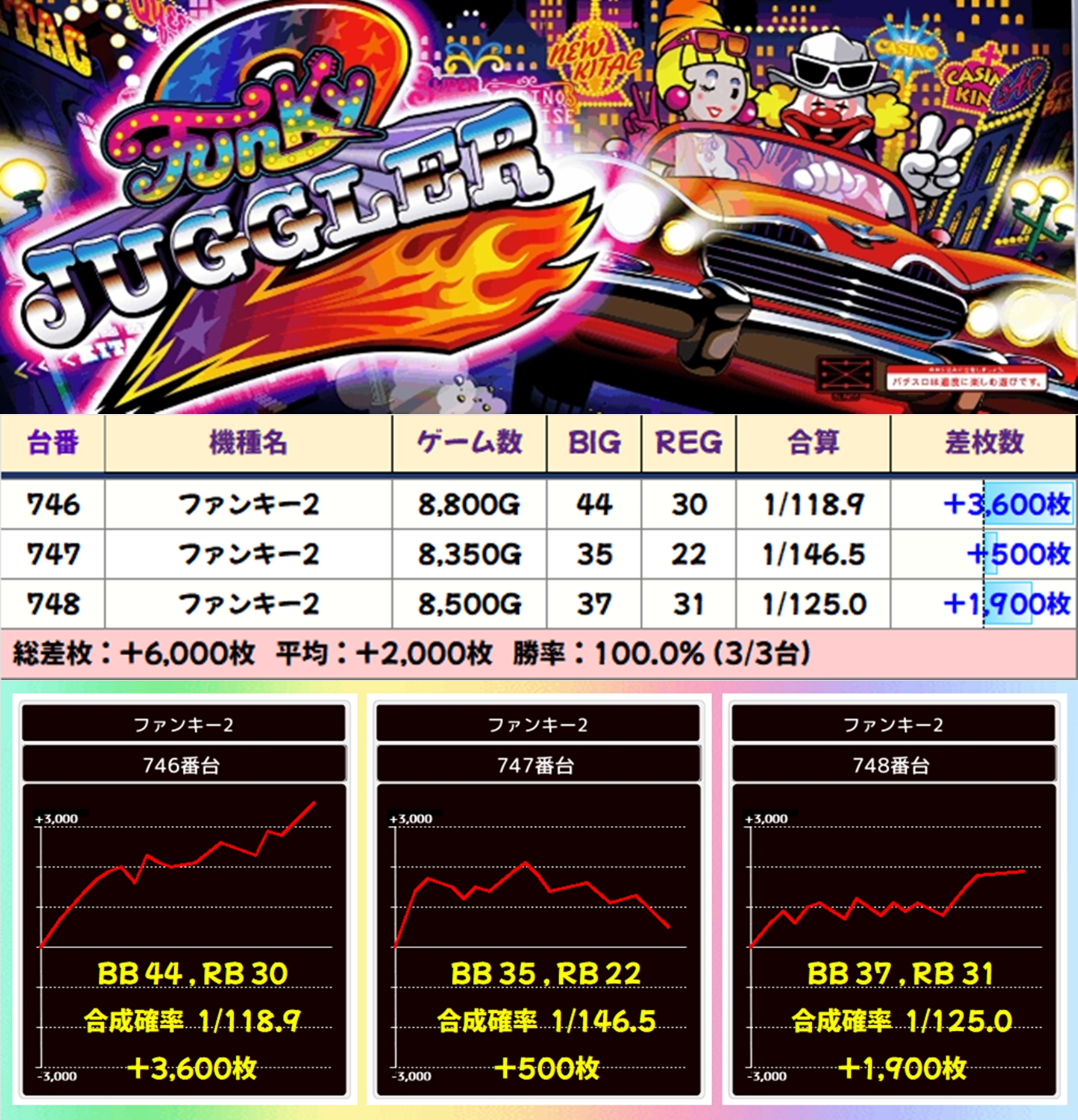 【3台並び】ファンキー2(746-748番台)→平均+2,000枚
