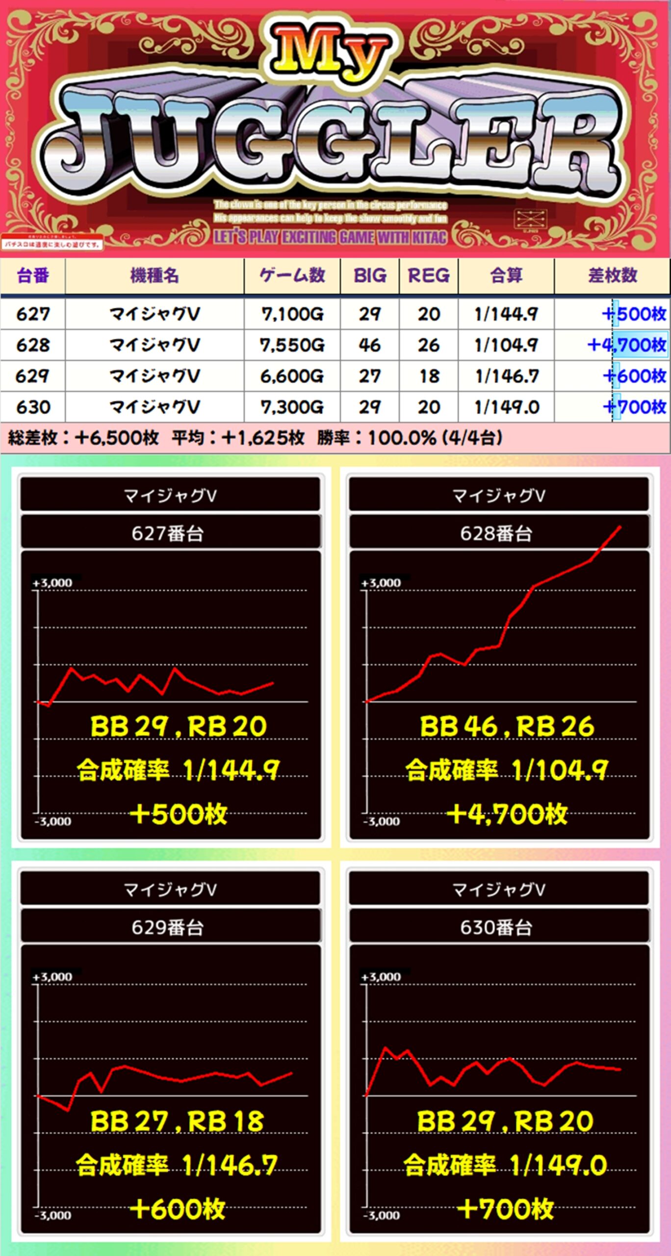 【4台並び】マイジャグV(627-630番台)→平均+1,625枚