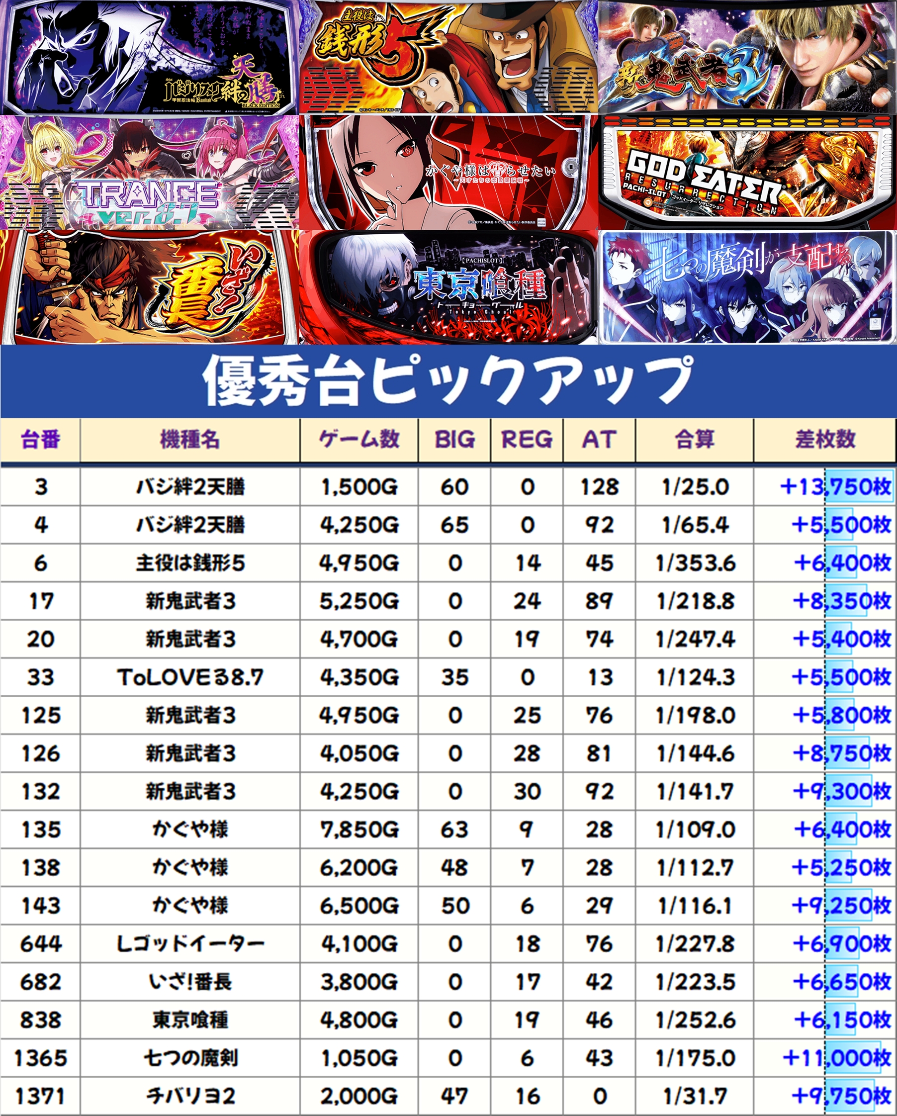 各機種の優秀台をピックアップしますので、データを確認してみましょう!