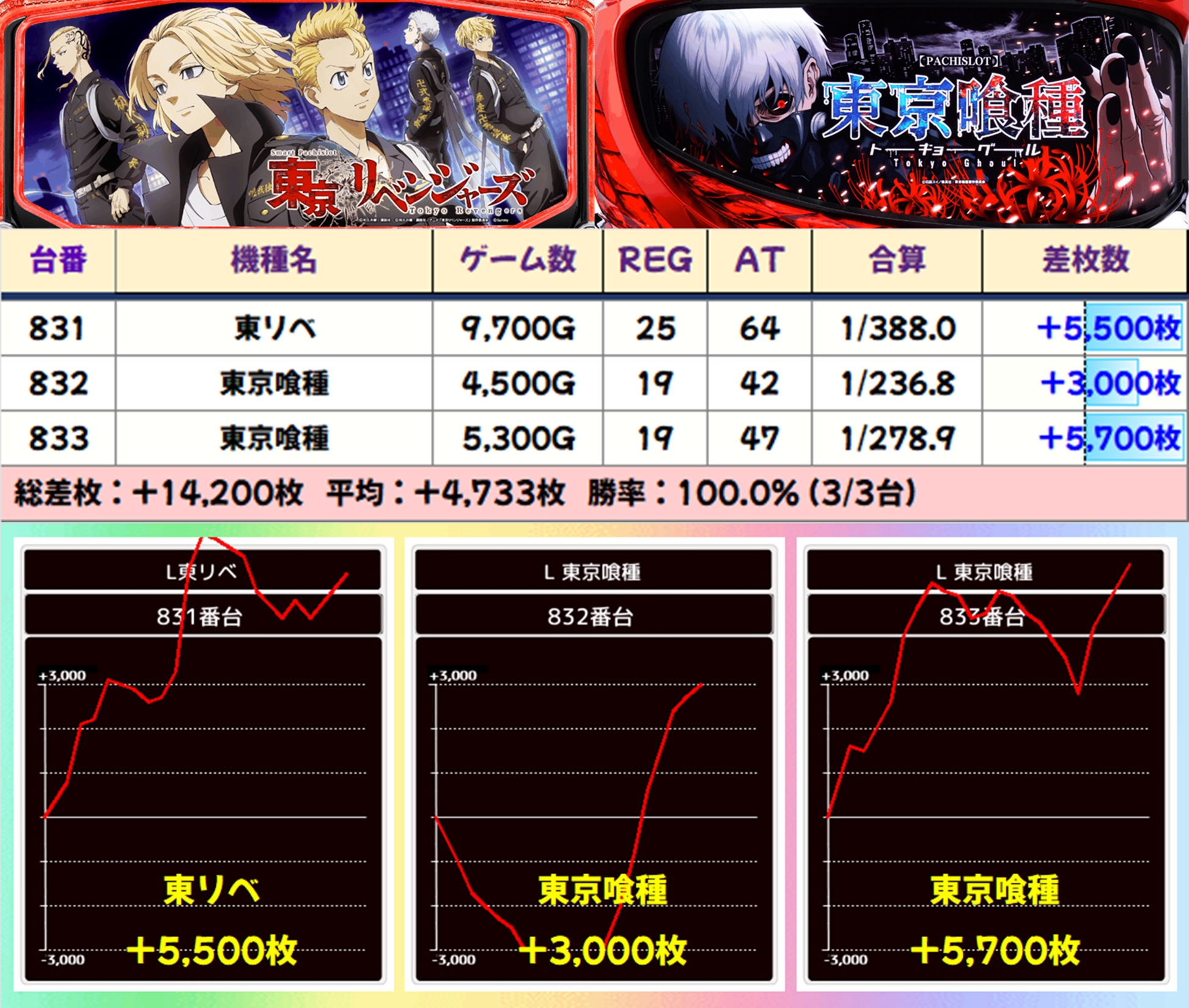 【3台並び】東リベ・東京喰種(831-833番台)→平均+4,733枚
