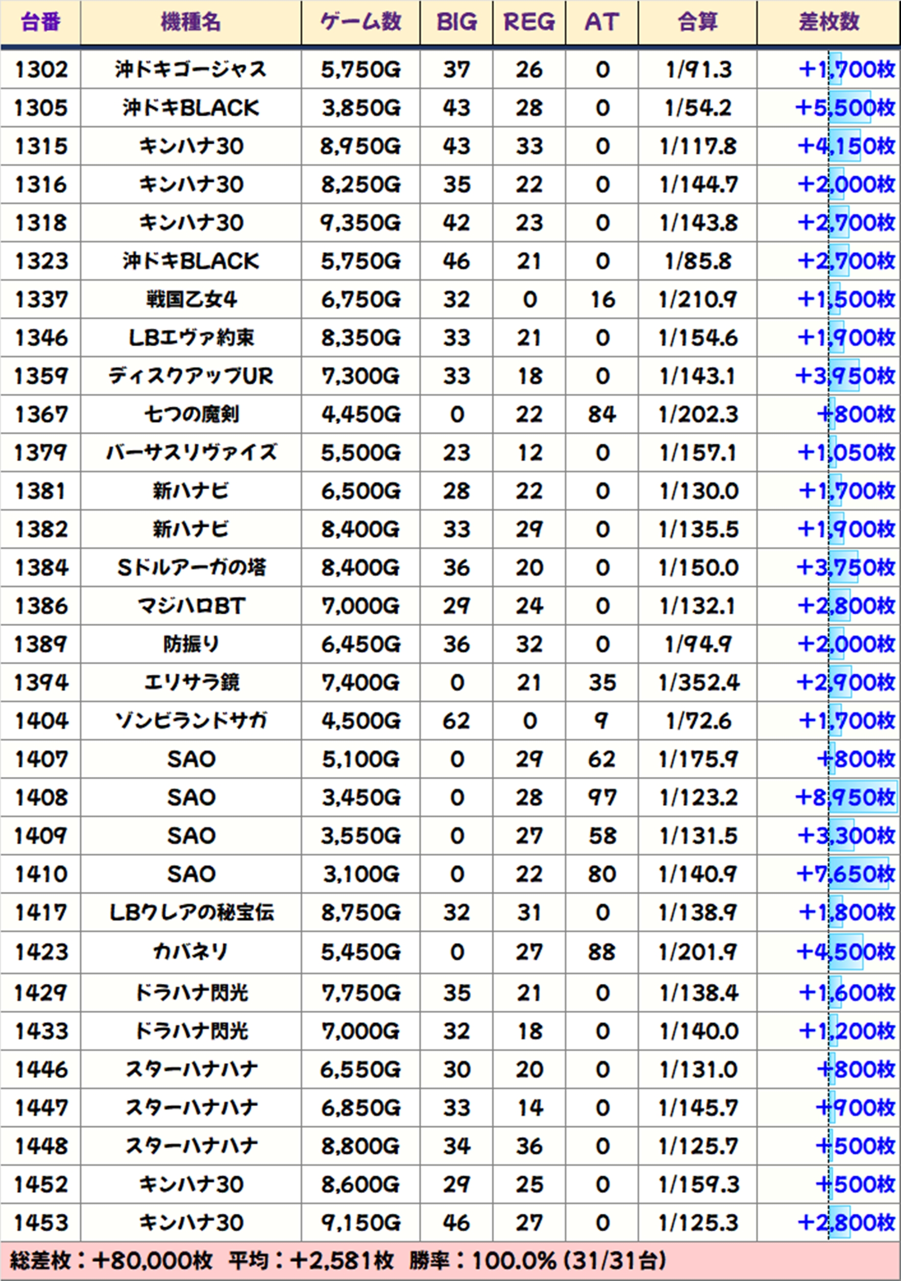 全台系濃厚や1/2系濃厚の仕掛けなども絡んでおり、31台のピックアップ台は全台がプラス差枚に。平均で+2581枚の優秀な結果となりました!