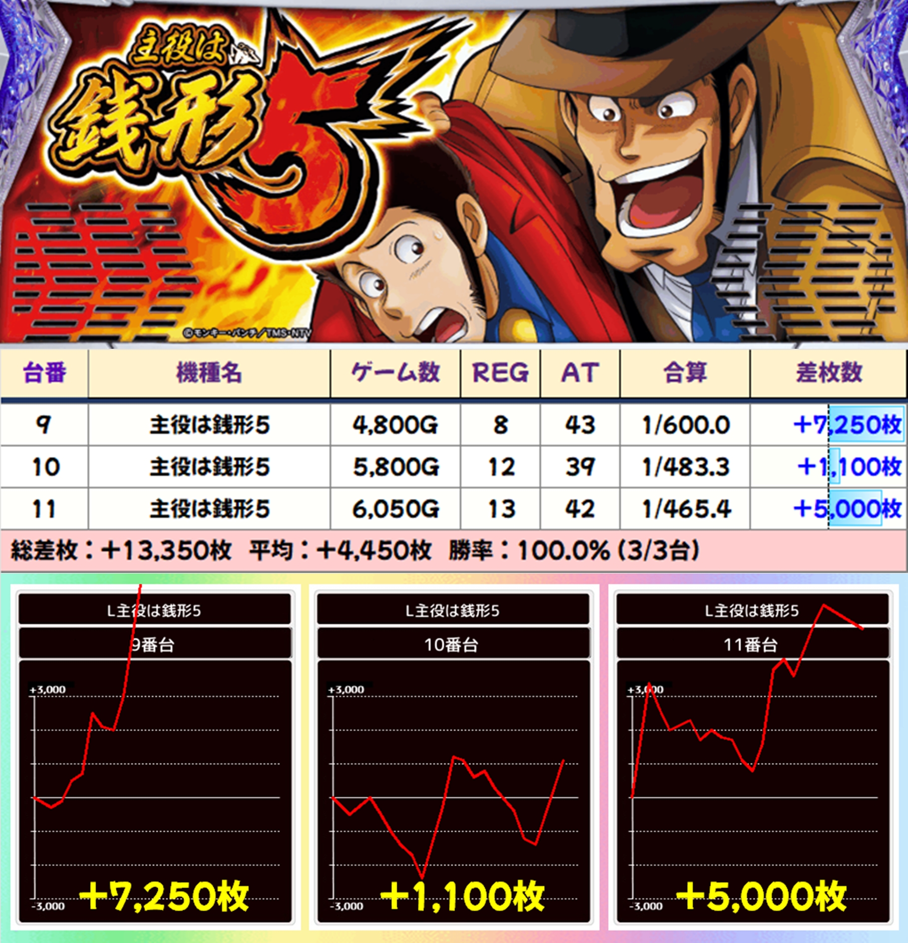 【3台並び】主役は銭形5(9-11番台)→平均+4,450枚