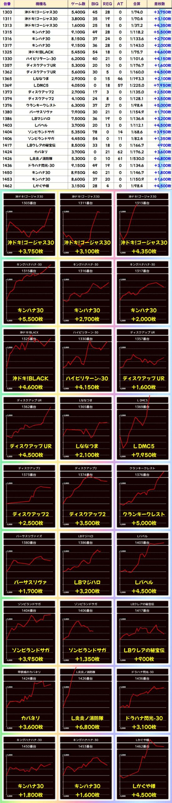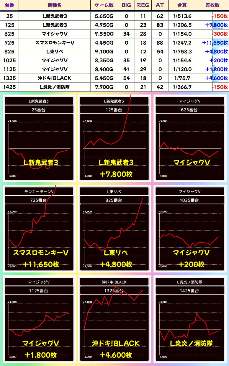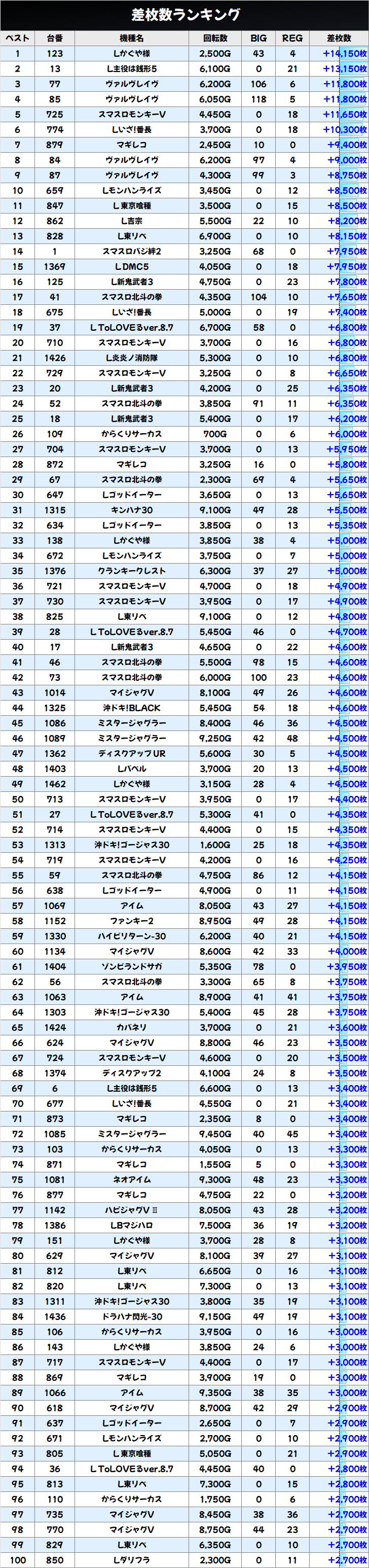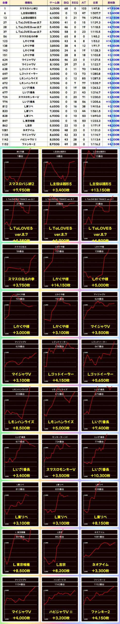 各機種の優秀台(+2000枚以上)をピックアップしていきますので、データをチェックして明日以降の参考にしてください!