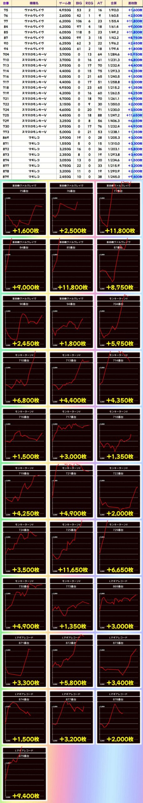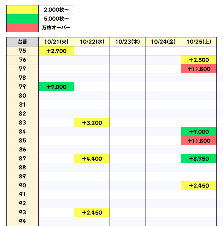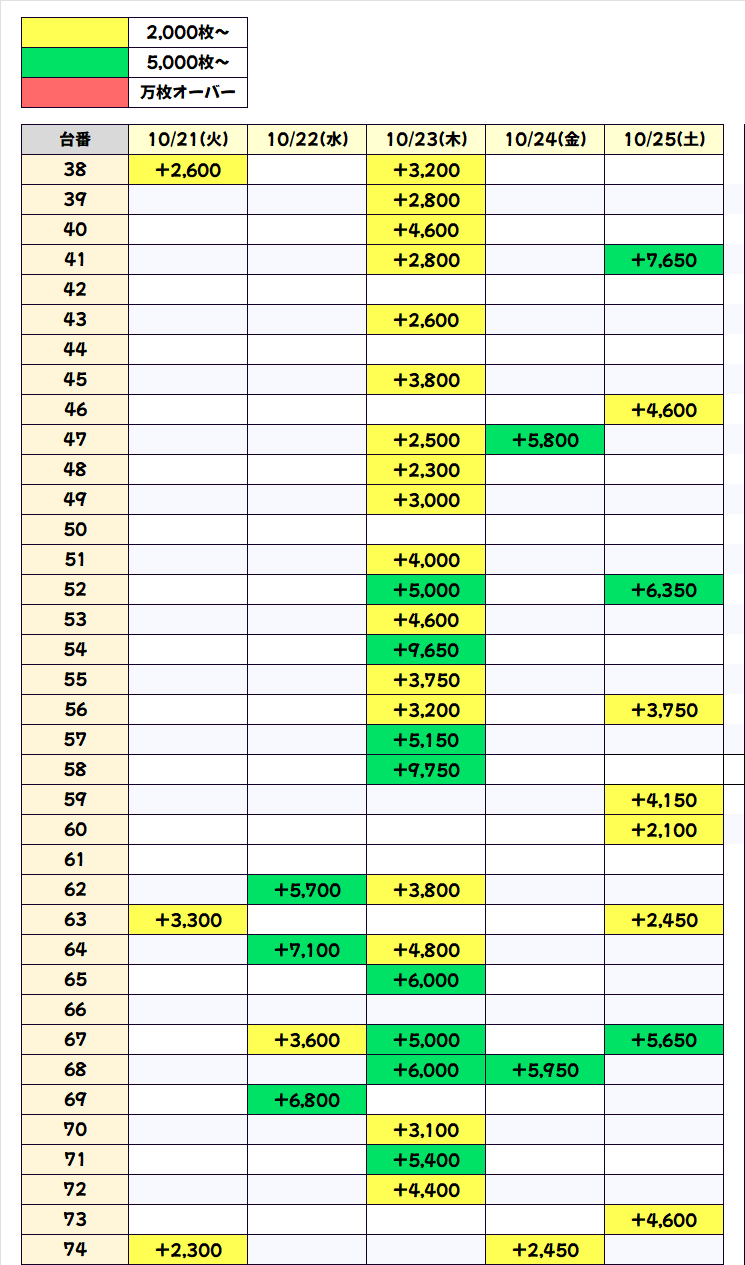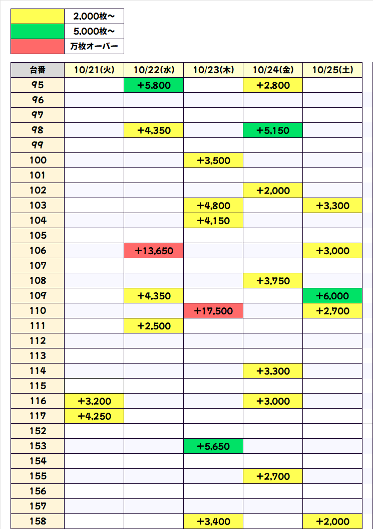 各機種の優秀台(+2000枚以上)をピックアップしていきますので、データをチェックして明日以降の参考にしてください!