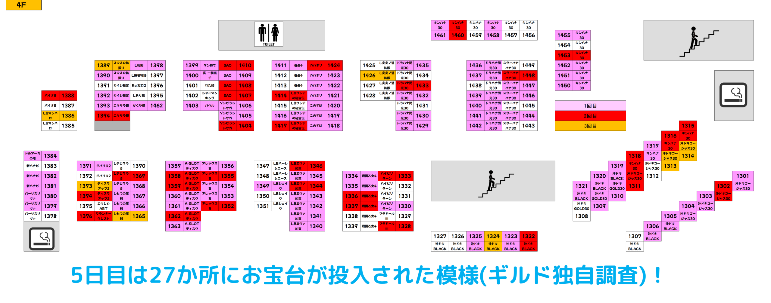 過去の傾向として27日までは対象フロアでのお宝台の大量投入に期待できますので、明日以降は積極的に4Fフロアを狙ってみるのも一つの手段と言えますね。